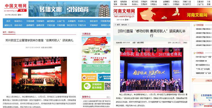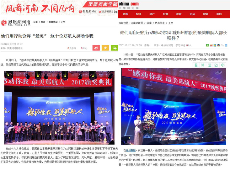 中国文明网及众多网络新媒纷纷报道我校“感动你我 最美郑航人”评选表彰活动 时间:2017年12月22日 作者:新闻中心 李绍巍 编辑:李绍巍 点击: 12月22日,中华网、凤凰网、香港中原网分别以 “他们用自己的行动感动你我 看郑州航院的最美航院人都长啥样?”、“他们用行动诠释‘最美’ 这十位郑航人感动你我”、“楷模引领校园风尚 郑州航院举行‘最美郑航人’颁奖典礼”为题聚焦报道我校开展的“感动你我 最美郑航人”评选表彰活动。 报道称,“在郑州航院,有这样一群人,他们用自己对工作的执着态度和对航院的热爱,奋战在郑州航院的各个岗位,他们有像母亲一样把学生当作自己的孩子来爱护的谢晓芳,有用自己的渊博知识无私奉献给学生的‘根哥’陈洪根,有在身体和精神的重压不改变对生活乐观态度的任炳安。他们用自己的行动演绎着‘一日郑航人 终身郑航人的’神话,他们把郑航当作自己的家,在这里绽放自己的青春和梦想。” 截止25日,中国文明网、河南文明网以及光明网、中原网、映象网、搜狐、腾讯等主流网站,郑州日报客户端《郑州观察》、郑州晚报客户端《身边》、猛犸新闻、今日头条、一点资讯等手机新闻客户端纷纷报道我校“感动你我最美郑航人”评选表彰活动。 报道指出,党的十九大报告提出,我国社会主要矛盾已经转化为人民日益增长的美好生活需要和不平衡不充分的发展之间的矛盾。教育,正是人民对美好生活需要的一个重要方面。本次活动中的所有获奖者都是坚守最平凡岗位的的教育工作者,用自己的真诚知识去成就自己不平凡的事业。数十位郑航人当选,他们展现了当代郑航人的最美精神风貌,绽放着这个时代的最美风华气质。 报道链接: http://zz.wenming.cn/wmzz_xwzx/201712/t20171225_4948904.html(中国文明网) http://difang.gmw.cn/ha/2017-12/22/content_27166412.htm(光明网) http://hen.wenming.cn/difangdongtai/201712/t20171225_4535097.html(河南文明网) http://hn.ifeng.com/a/20171222/6249692_0.shtml(凤凰新闻) http://henan.china.com/news/hot/11185120/20171222/25156771.html(中华网) http://www.dgbzy.com/html/2017/n1222c3219.html(香港中原网) http://www.hnr.cn/newedu/gx/xwsd/201712/t20171225_3049009.html(映象网) http://edu.zynews.cn/e/wap/show.php?classid=802&id=22992(中原网) http://news.sciencenet.cn/htmlnews/2017/12/398016.shtm(科学网) http://mwap.zzwb.cn/news/107540?suid=145B2929D63286FA(郑州晚报客户端) http://wap.zzrbnews.com/html/chengshi/201712/50535.html?suid=F4C7E5FCFC20267A#eyJwYXJhbXMiOnt9LCJoYXNoIjoiYmFvbWluZ19zZWN0aW9uIiwidXJsIjoiYmFvbWluZ19zZWN0aW9uLmh0bWwifQ%3D%3D(郑州日报客户端) http://mengma.jinbw.com.cn:53808/queryNewsStringById.do?newid=1133995&flag=1&userid=18503(猛犸新闻) https://www.toutiao.com/i6502369211459830285/?tt_from=weixin&utm_campaign=client_share&app=news_article&utm_source=weixin&iid=20523173743&utm_medium=toutiao_ios&wxshare_count=1(今日头条) https://view.inews.qq.com/a/20171222A0ZWE000(腾讯新闻) https://3g.k.sohu.com/t/n250182100?gotoId=250182100(搜狐) https://mbd.baidu.com/newspage/data/landingshare?context=%7B%22nid%22%3A%22news_9842585305879958039%22%7D&page=landingshare(百度) https://www.yidianzixun.com/article/0HyMrfzQ?title_sn=0&yidian_dtype=3&utk=3cldkzfw&appid=yidian&ver=4.5.4.8&f=ios&s=3(一点资讯) 2017年12月22日 资讯快报 上一条:我校在2017年度“全省高校校园不良借贷风险防范和教育引导工作优秀作品评选活动”中获多个奖项 下一条:我校荣获全省第五届大学生宗教理论知识竞赛三等奖 【关闭】