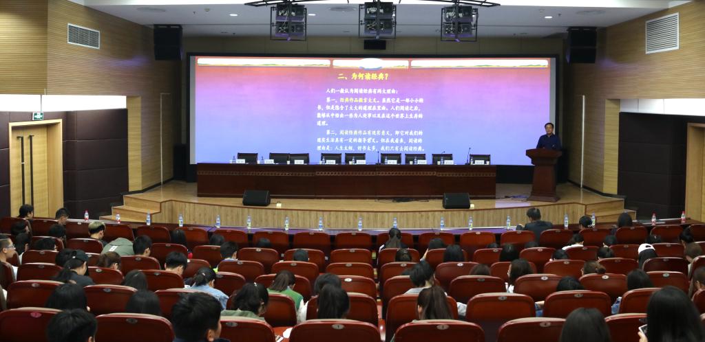 启动仪式现场,郑州大学教授崔波应邀作了题为《阅读经典与人生智慧》的专题报告。报告从经典文化书籍的阅读谈起,围绕为什么要读经典、经典阅读的内容与文化自信的确立、人生智慧的培育等方面展开。崔波认为,经典阅读要从自身做起,通过阅读经典书籍提高和加强综合素质,传承传统文化,为建设书香校园做出努力。