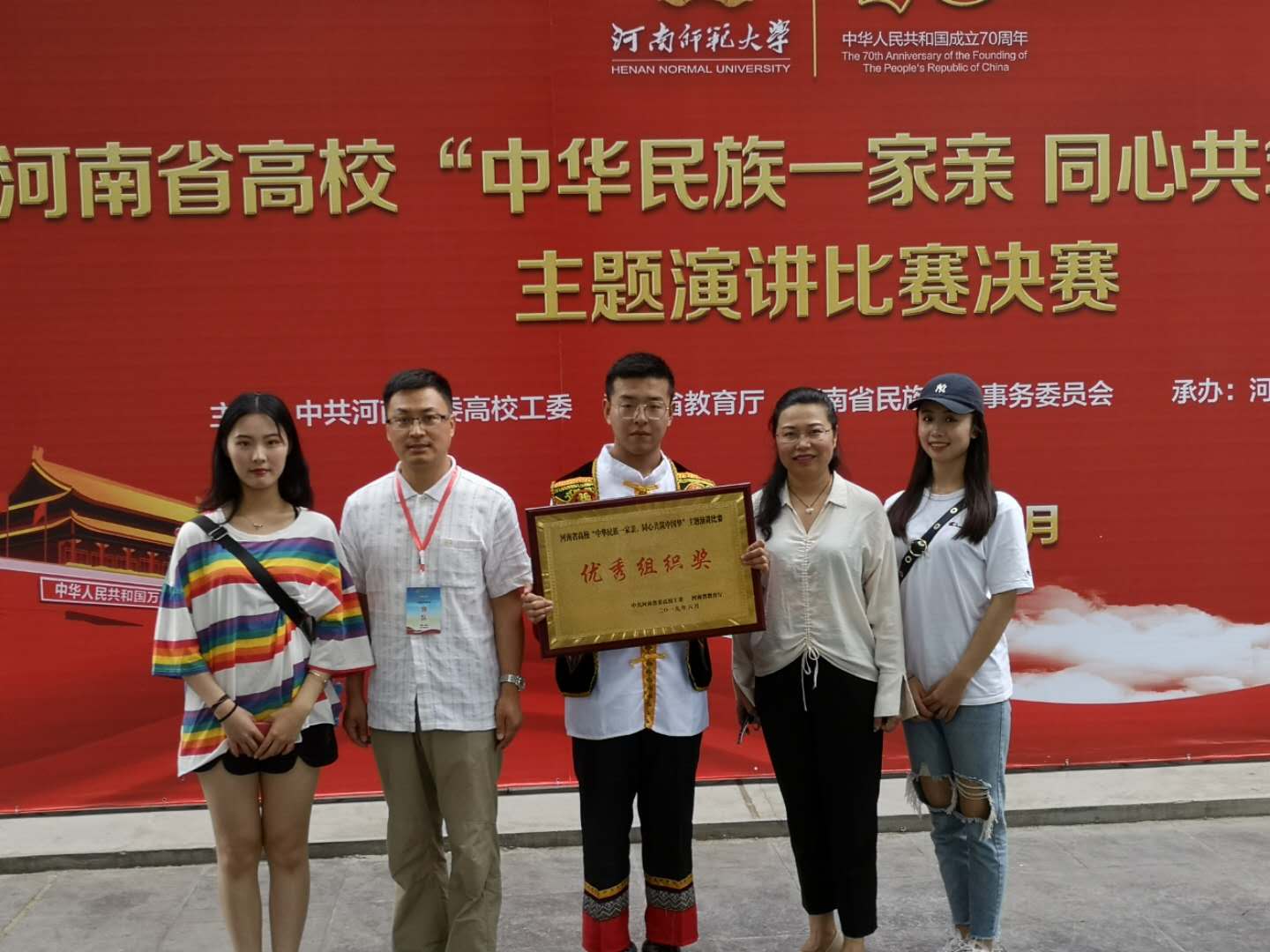 我校在全省高校“中华民族一家亲 同心共筑中国梦”主题演讲比赛中斩获一等奖 时间:2019年06月24日 作者:统战部 张鹂图文 编辑:新闻中心 点击: 6月21日,由省委高校工委、省教育厅、省民委共同主办的全省高校“中华民族一家亲 同心共筑中国梦”主题演讲比赛决赛在河南师范大学举行。经过激烈角逐,我校参赛选手文法学院2016级学生邱梦豪勇夺一等奖,我校荣获优秀组织奖。 省委高校工委专职委员高治军,省委统战部知工处处长王亚伟,省民族宗教委民族关系处调研员孙士文,省委高校工委、教育厅副总督学韩冰,省委高校工委、省教育厅统战处副处长高峰出席开幕式。 本次比赛以“中华民族一家亲 同心共筑中国梦”为主题,经过初赛、复赛,共有45所高校从全省101所参赛高校中脱颖而出进入决赛。 决赛中,我校邱梦豪同学以《以情筑梦 耀我中华》为题,通过讲述亲身经历的故事,深刻阐述了民族团结的重大意义。邱梦豪以饱含深情的演讲和感人的民族故事,赢得了现场观众阵阵掌声,最终夺得一等奖。 2019年06月24日 资讯快报 上一条:全国邮政行业职业技能竞赛河南省选拔赛在我校举行 下一条:我校体育舞蹈在河南省第四届学生体育舞蹈锦标赛中获第一名 【关闭】