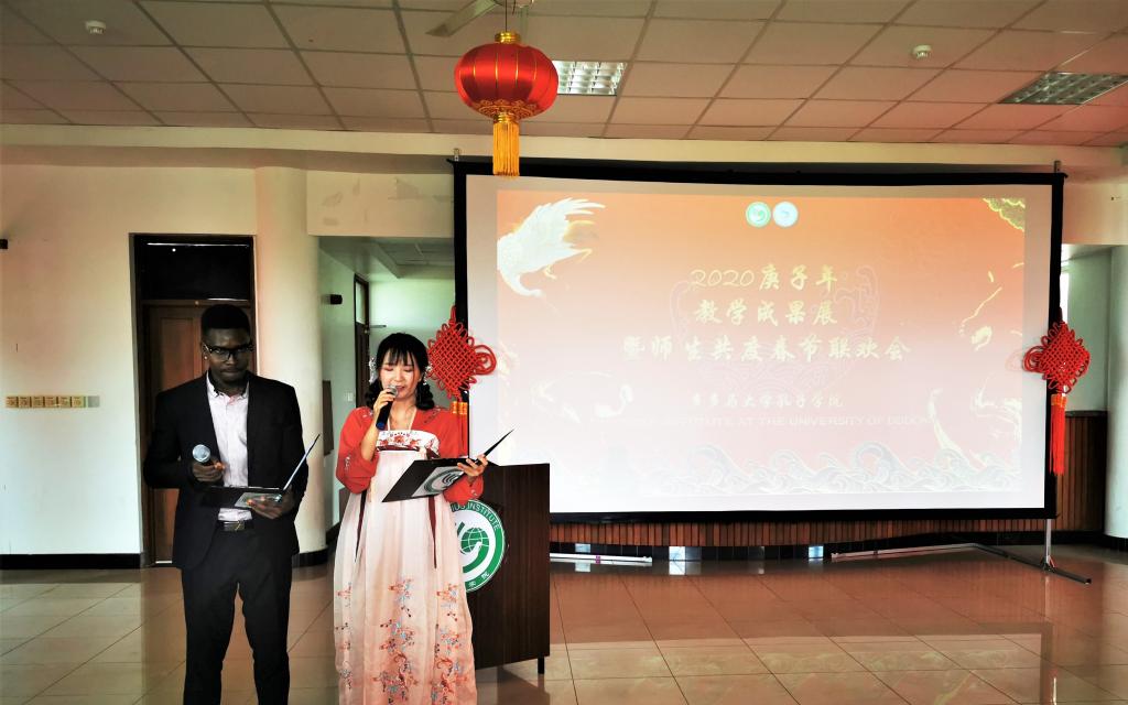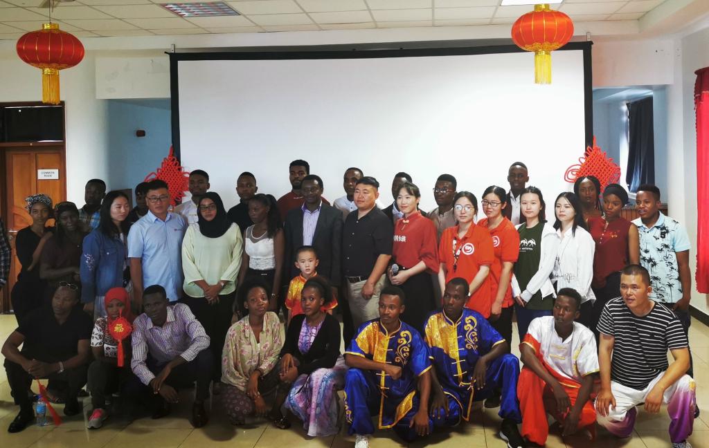 当地时间1月24日,郑州航院—多多马大学孔子学院举办“迎庚子孔院教学成果展暨师生共度春节联欢会”活动。郑州航院—多多马大学商法学院院长Amani博士,人文社科学院院长Tenge教授的代表Fatma女士,中铁七局常彦军先生、张健先生,孔子学院中方院长杨伦博士,孔院师生及孔院武术队等300余人参与此次活动。