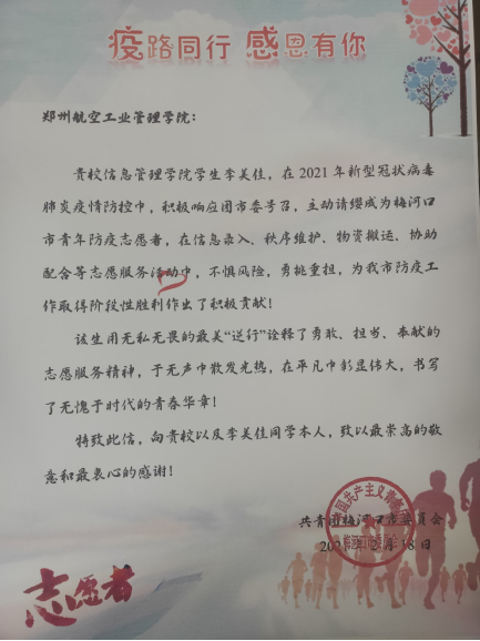 同为信息管理学院的学生李美佳也收到了一封来自共青团梅河口委员会的感谢信,感谢她在梅河口市防疫工作做出的积极贡献。