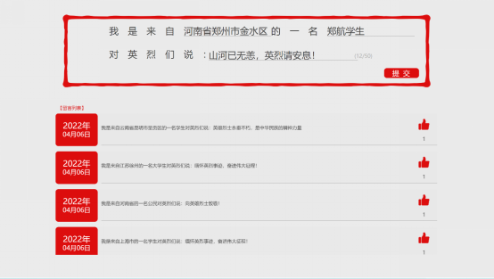 此次活动以线上的形式开展,学生们登陆郑州文明网,进行“云献花”“云升旗”“云敬礼”,发表自己的云寄语,寄托自己对英雄先烈的缅怀,表达对英雄先烈的崇高敬意。