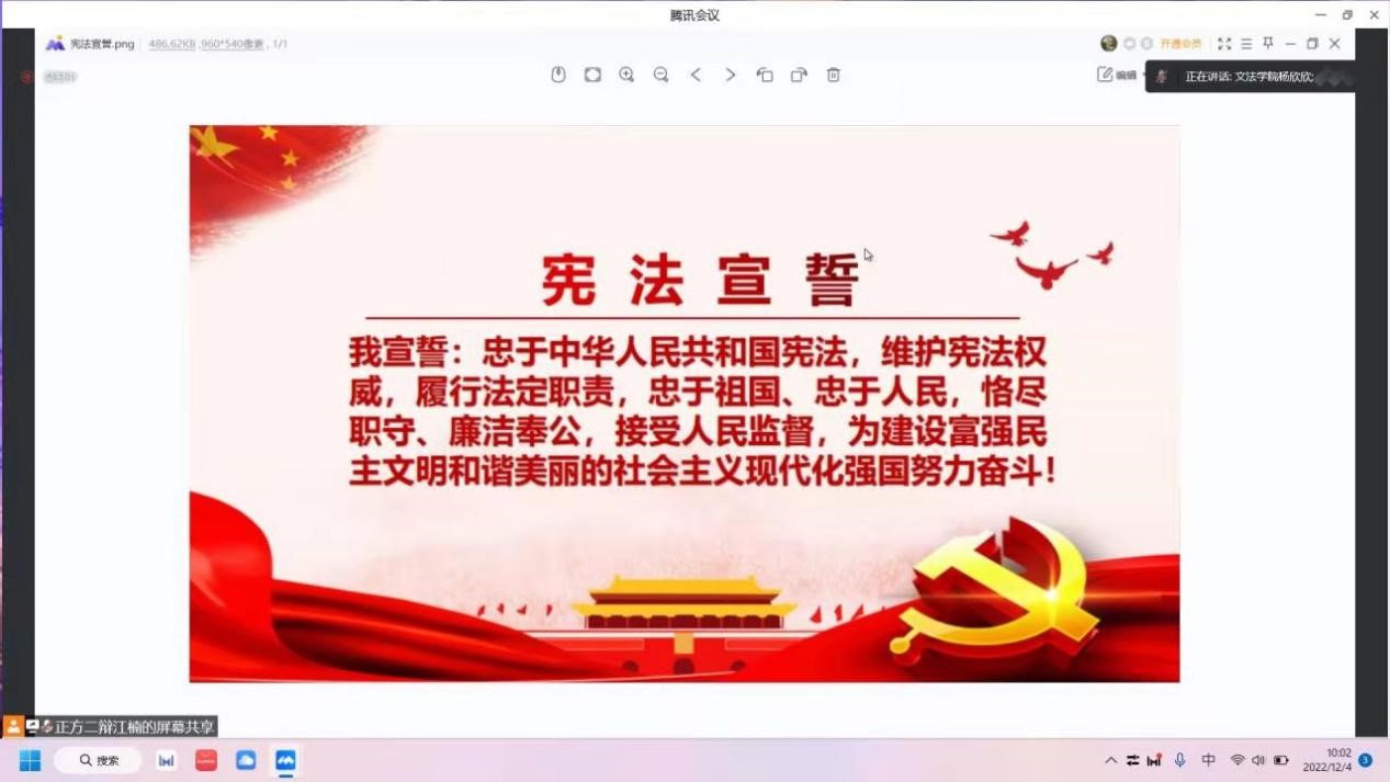 2022年12月4日,是我国第九个宪法日,恰逢《中华人民共和国宪法》颁布实施40周年。今年宪法日的主题是“学习宣传贯彻党的二十大精神,推动全面贯彻实施宪法”。为学习宣传党中央全面依法治国、推进法治中国建设的重大部署,学习宣传贯彻党的二十大精神,我校积极响应国家号召,于12月4日上午组织在线开展“一堂特殊的宪法课”特别活动。