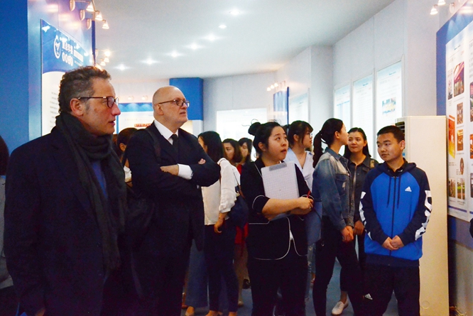 在国际合作与交流处处长杨欣欣、外国语学院院长郭银铃等人陪同带领下,代表团一行参观了我校校史馆及法语联盟未来建设用地。