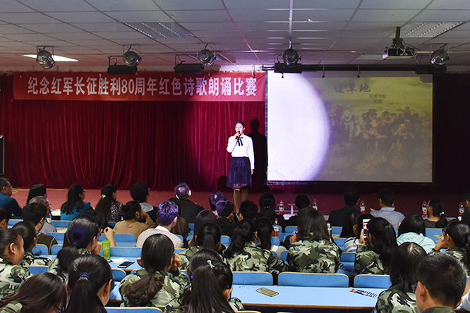 10月17日晚,由党委宣传部主办,人文社会科学学院承办的“纪念红军长征胜利80周年红色诗歌朗诵比赛”在01A203举办,来自全校300余名师生观看比赛。比赛的举行也标志着我校纪念红军长征胜利80周年系列活动进入高潮阶段。