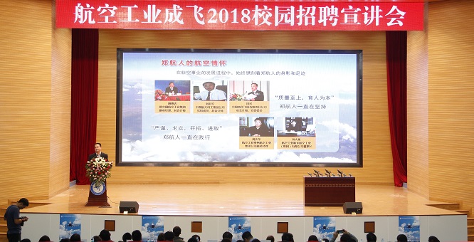 倪永锋对我校在航空工业人才培养、科学研究、社会服务等诸多方面的优势地位及发展情况给予充分肯定。“成飞集团近年来发展迅猛,基础科研能力需要不断加强。”他希望,“双方能够进一步加强深度合作与交流,希望通过此次招聘从贵校吸纳更多优秀人才加盟成飞集团”。 “让航空事业的发展进程中,始终镌刻郑航人的身影和足迹” 成飞集团在我校举办校园宣讲尚属首次。宣讲会上,石培哲代表我校致辞。他回顾了成飞和郑航长久以来的密切合作,细致解读了学校一以贯之的“情系航空,服务航空,为航空工业输送人才”的育才理念。他勉励应届毕业生,“要以最充分的准备、最昂扬的精神面貌迎接成飞的选拔”。他向在校大学生提出希望,“让航空事业的发展进程中,始终镌刻郑航人的身影和足迹。”