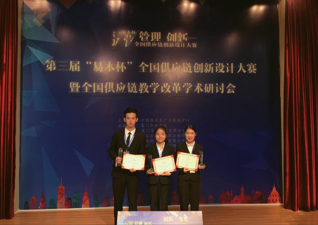 近日,“易木杯”第三届全国供应链创新设计大赛全国总决赛在厦门举行,我校参赛团队首次斩获一等奖,在此项赛事中取得突破性进展;同时,指导老师付赟、郭利利获“优秀指导教师”称号,团队荣获“最佳营销团队”和“最佳采购团队”荣誉称号。
