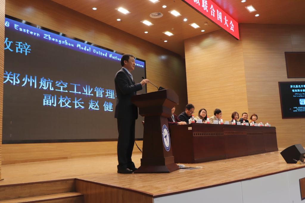 赵健在开幕式上致辞。他说,模拟联合国是一项极富教育意义的活动,在创建广泛交流平台的同时,使更多在校大学生收获更多相互沟通和阐述各自观点的实践经验,希望参会代表们共同努力,推动中国模拟联合国活动的发展。