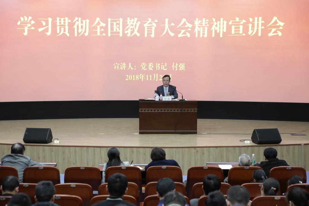 付强要求,全校教职员工要以深入学习宣传贯彻全国教育大会精神为契机,强化责任担当,抓好大会精神的落地生根、取得实效,推动学校实现高质量发展。一是要切实提高政治站位,充分认识全国教育大会的重大意义。要把深入学习全国教育大会精神作为当前重大的政治任务和政治责任抓紧抓实抓细;要把学习贯彻大会上的重要讲话与贯彻落实党的十九大精神、全国高校思想政治工作会议精神、习近平总书记关于高等教育系列重要讲话精神融汇贯通,深入学习领会,全面准确把握,以期学有所得、得而能用、用能生巧。二是要结合学校实际,将全国教育大会精神内化于心、外化于行。付强指出,学校的任务是贯彻落实中央和省委的决策部署,加快推进学校综合改革的进度和步伐,不断增强学校核心竞争力和发展实力,切实推动学校各项事业发展。他强调,当前和今后一个时期,学校将切实加强党的领导和党的建设,全面实施新时代立德树人工程,深化教育综合改革,着力加强新时代教师队伍建设,继续凝练学科方向争取高层次科研成果,提升服务社会的质量和水平,构建开放办学新格局。三是要不断改变教育理念,更新教育观念。全校教职员工要锐意进取、敢于创新,更新教育理念,创新教学模式,以本为本,全面提高教学质量。