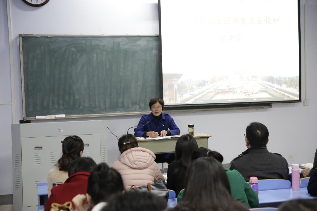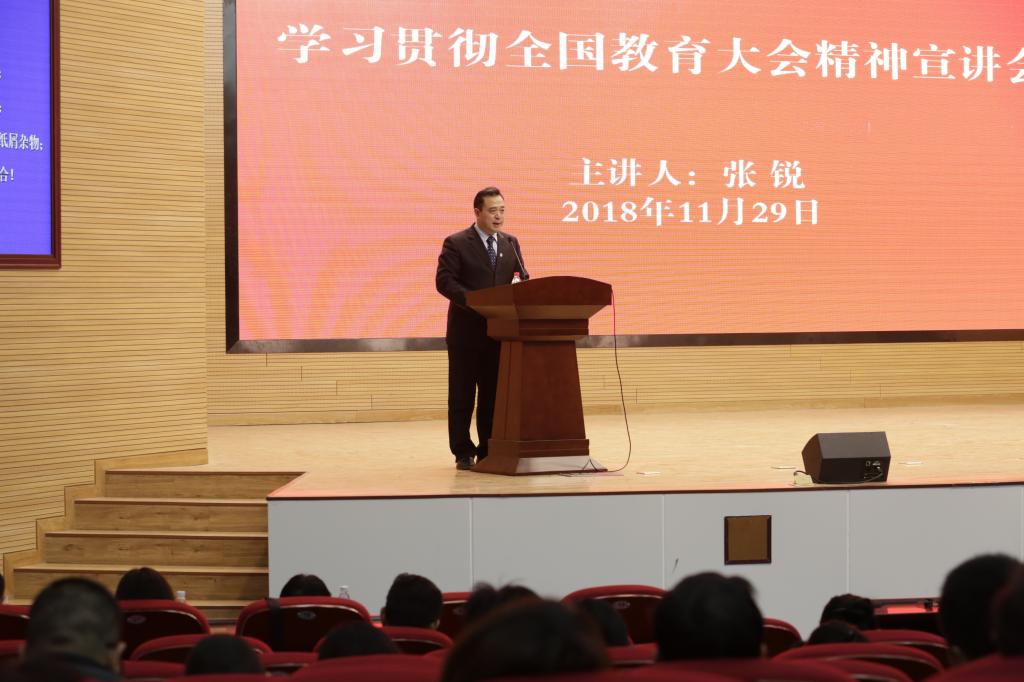 宣讲报告会上,付强传达了教育部《全国教育大会精神宣讲参考提纲》和《中共河南省委宣传部、中共河南省委高校工委、中共河南省教育厅党组关于深入学习宣传贯彻全国教育大会精神的通知》,从“充分认识全国教育大会重大意义”“深入学习领会习近平总书记关于教育的重要论述”“扎实推进加快教育现代化的重点任务”“全力确保教育大会精神落实落地”四个方面进行宣讲。