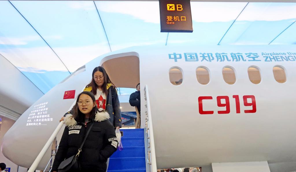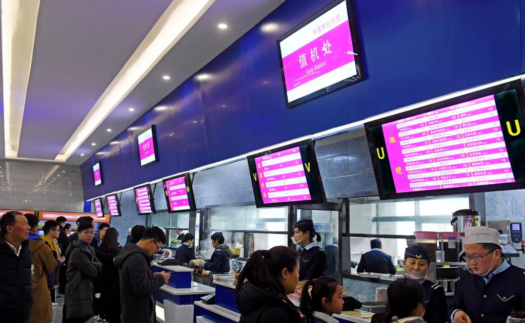 一架国产C919飞机模型亮相东苑餐厅三楼,售饭窗口“变身”值机柜台,“国内航班候机区”导视牌、星空顶灯……,东苑餐厅的每个细节处理都给人一种登机的真实感,吸引了众多师生前来参观、体验、就餐。