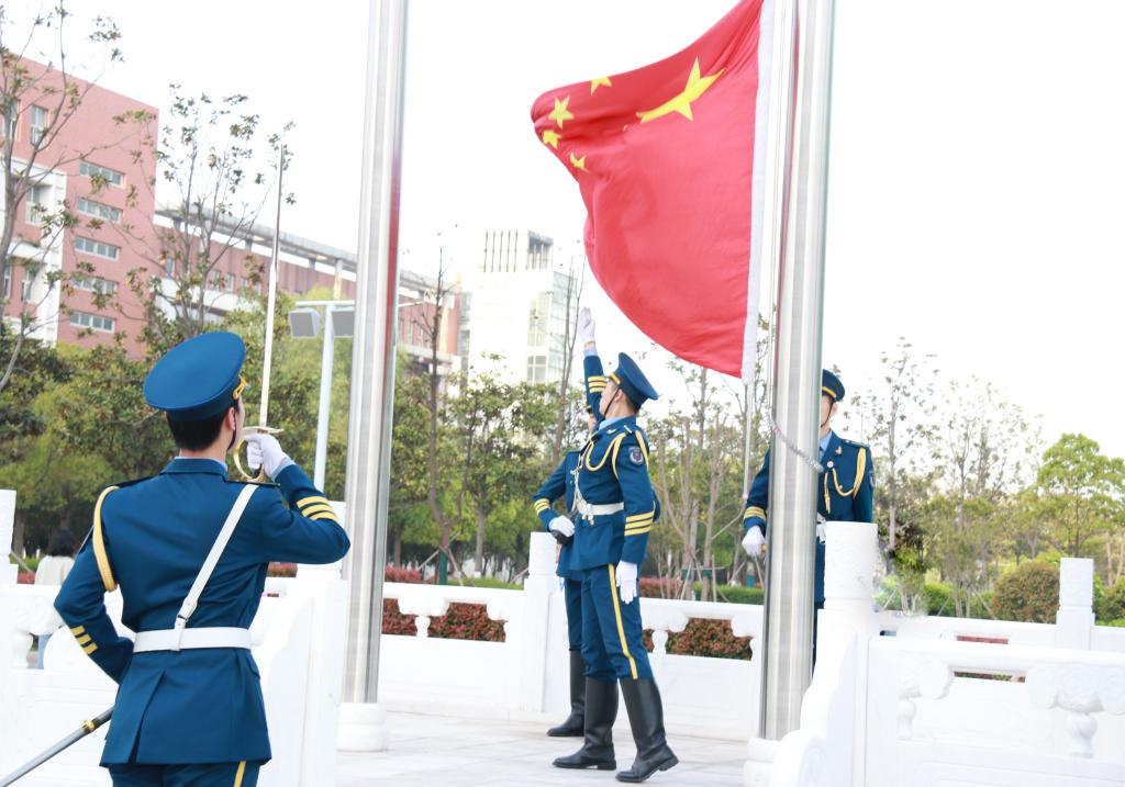 仪式在清晨的阳光中拉开序幕。“迎国旗!”国旗护卫队队员迈着整齐划一、铿锵有力的步伐护送国旗至国旗台。伴随着庄严嘹亮的国歌,鲜艳的五星红旗冉冉升起,参加升旗仪式的师生面向国旗,肃立致敬,行注目礼。