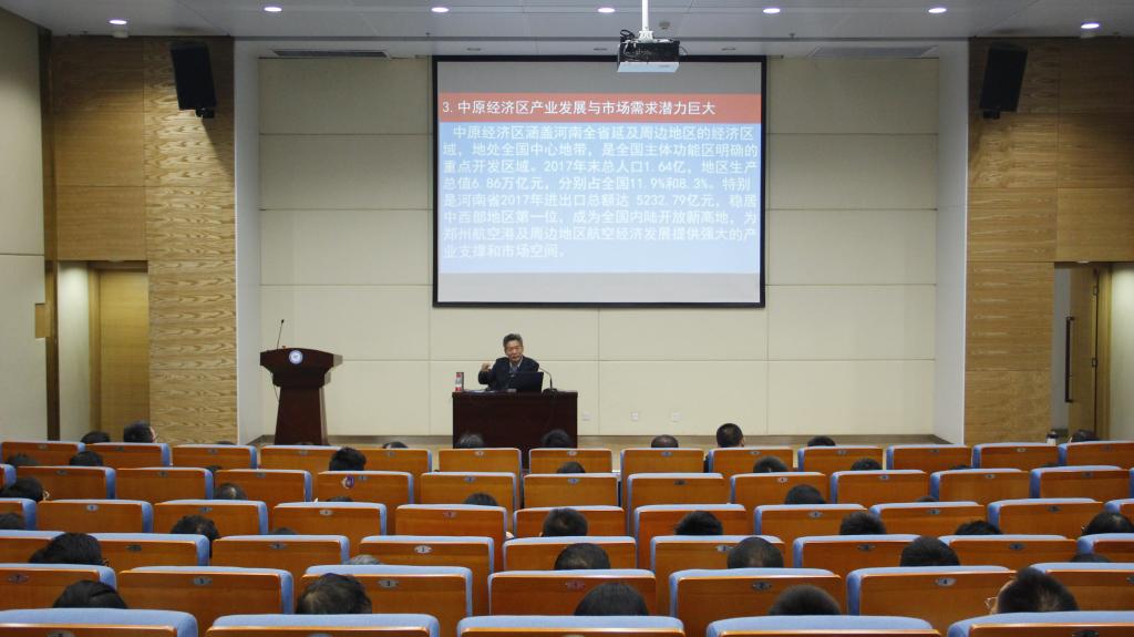结合我校即将进行的教育思想大讨论活动,为进一步提升学校服务地方区域经济和航空产业的能力,更好融入国家“一带一路”建设,4月26日,原河南省社会科学院院长张占仓研究员受学校邀请,在图书馆第三报告厅作题为“建设郑州——卢森堡‘空中丝绸之路’的战略机遇与前景研究”专题报告。报告会由副院长李广慧主持并致欢迎辞。