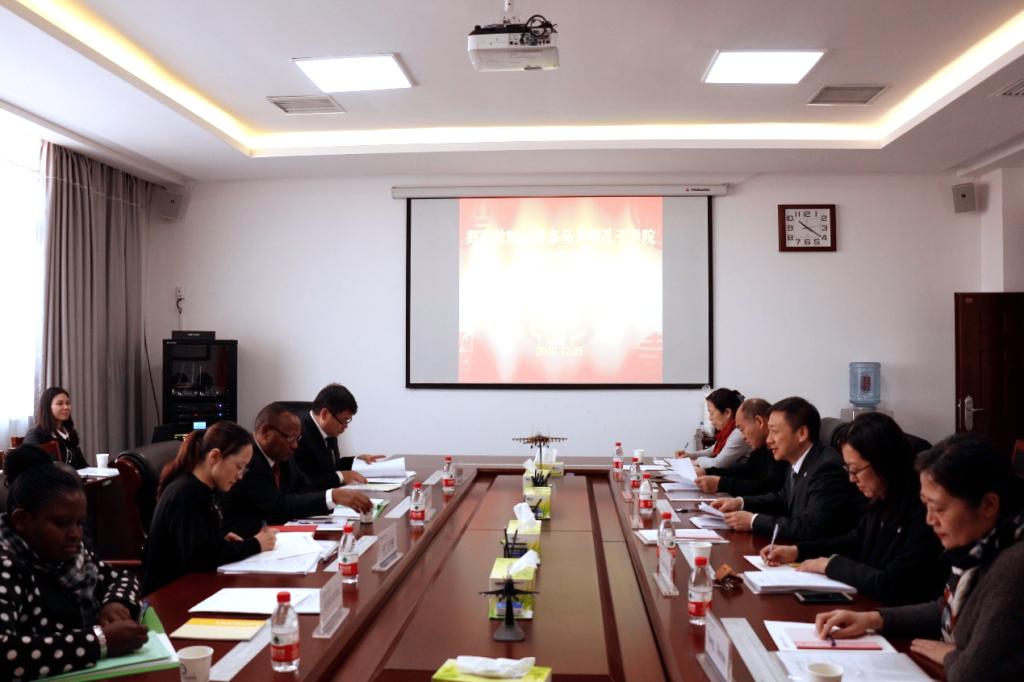 12月5日,坦桑尼亚多多马大学校长法斯廷纳·贝教授率郑州航院—多多马大学孔子学院中外方院长一行来访我校,并参加郑州航院—多多马大学孔子学院第七次理事会议。院长李勇、副院长赵健亲切会见了代表团一行。