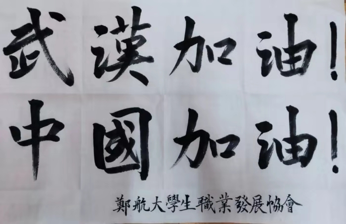 郑航学生社团联合会及其社团积极响应,通过视频、诗歌、书法、绘画等多种形式为战胜疫情助力。世纪风文学社创作的《满江红•致武汉》、职业发展协会的书法作品“武汉加油!中国加油!”Idea精英协会绘制“防治疫情 从我做起”主题海报、英语协会录制疫情防控知识英文视频、自强社将成员手持“加油武汉 加油中国”的图片拼成了“武汉”字样。