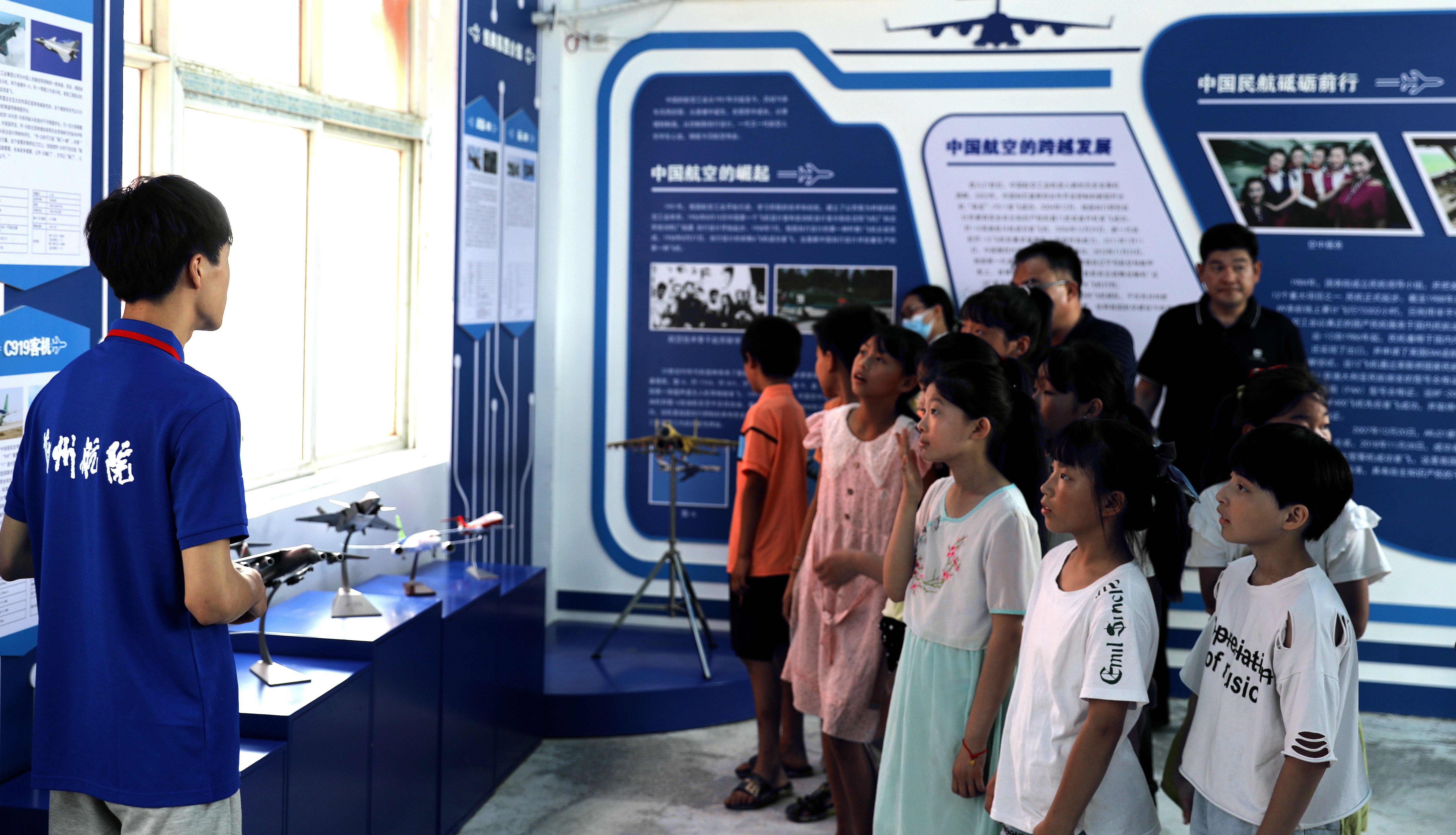 李胜伟和关亮为航空科普馆揭牌。揭牌仪式结束后,全体人员和小学生们一同参观航空科普馆。志愿服务队成员详细解说世界航空简史、中国航空简史、航空英模及我国现役经典机型,并通过自制的飞行模拟器讲解飞行原理。