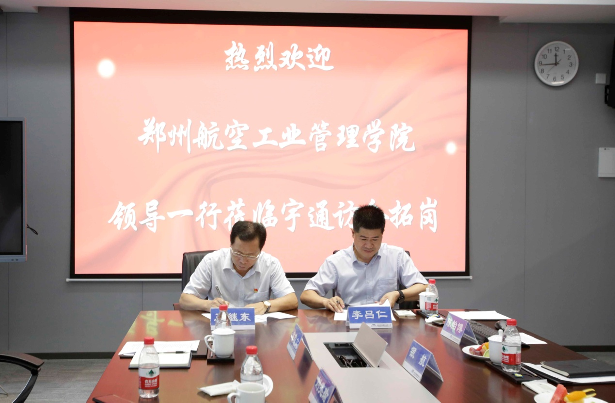 刘代军和杨祥盈共同为郑州航院毕业生就业实习基地揭牌。副校长王继东、宇通培训中心主任李吕仁分别代表校企双方签署郑州航院毕业生就业基地建设协议。校企双方还就学校毕业生就业情况及就业关口前移探索、企业人才培养体系和招聘工作开展情况进行深入交流。