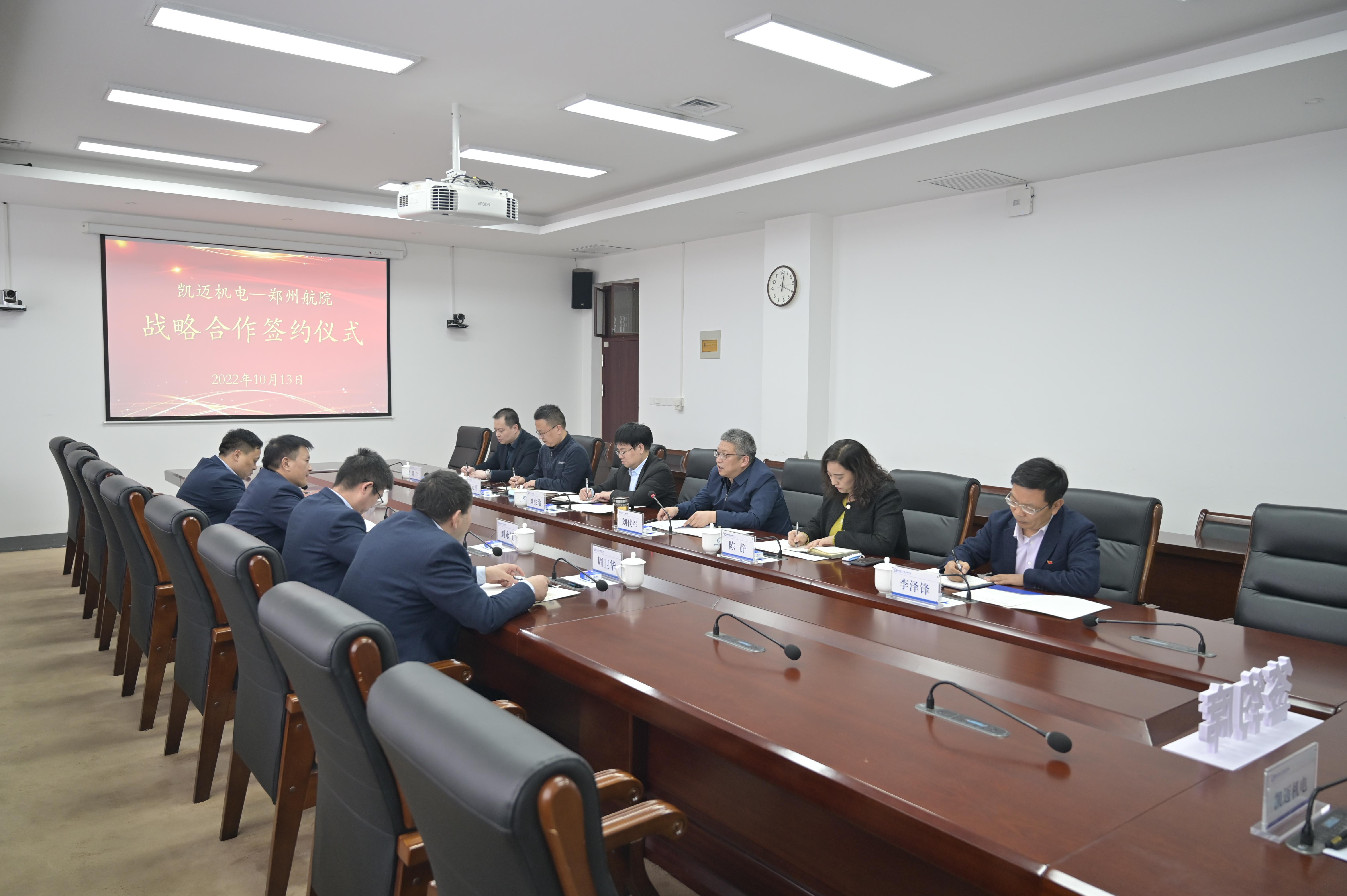 10月13日,郑州航院与凯迈(洛阳)机电有限公司战略合作框架协议签约仪式在我校举行。校长刘代军,凯迈机电有限公司总经理刘永红、党委书记酒迎军,凯迈机电汽车零部件公司总经理周卫华、副总经理张学申出席签约仪式。