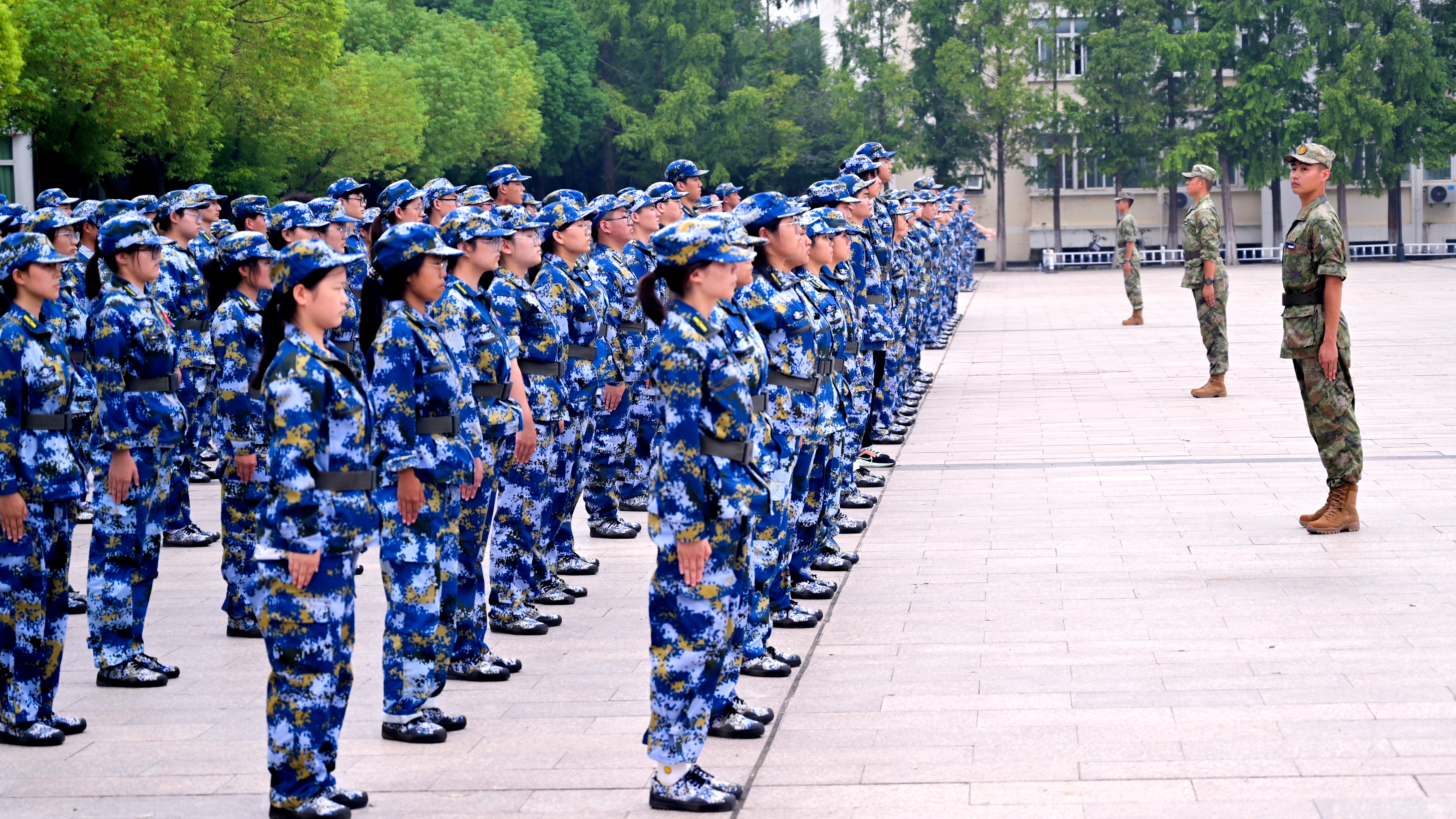 训练场上,同学们队列整齐,身姿挺拔,斗志昂扬,彰显着郑航青年英姿飒爽、昂扬向上的精神风貌。校领导走近训练方阵,驻足观看学生训练。