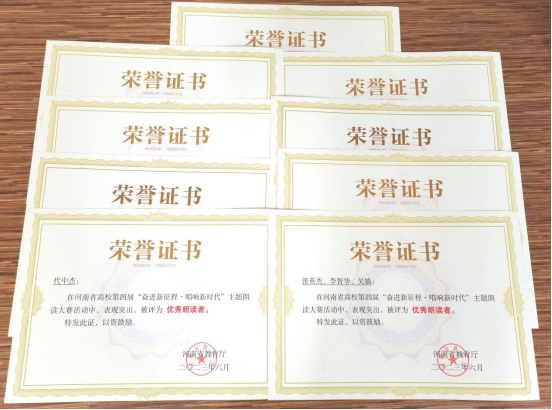 我校在河南省高校第四届主题朗读活动中荣获佳绩 时间:2023年09月20日 作者:图书馆 郭家锐 文图 编辑:党委宣传部(新闻中心)邓彦雯 点击: 近日,河南省教育厅发文公布河南省高校第四届“奋进新征程•唱响新时代”主题朗读活动“优秀朗读者”。我校教师组代中杰、杨新慧、荆利红、蔡云、刘秋萍、马倩、李筱宁、于海莉、郭家锐,学生组张英杰、李智华、吴嫱荣获“优秀朗读者”称号,杨晨获得由河南省高校图工委颁发的优秀指导老师奖。 本次活动旨在进一步发挥高校图书馆的文化育人功能,推进全民阅读活动在高校深入发展,推动书香社会建设,共有来自全省高校的51631位师生提交朗读作品。我校图书馆积极响应,精心组织,进行校内专家评审和推选,最终,教师组《论党的青年工作》等五部朗读作品,学生组《永不消逝的声音》、《中华,中华》两部朗读作品荣获由河南省教育厅授予的荣誉证书。 2023年09月20日 新闻头条 上一条:宣讲团走进军训现场开展国家安全宣讲活动 下一条:河南省航空材料与应用技术重点实验室第二届学术委员会第一次会议召开 【关闭】