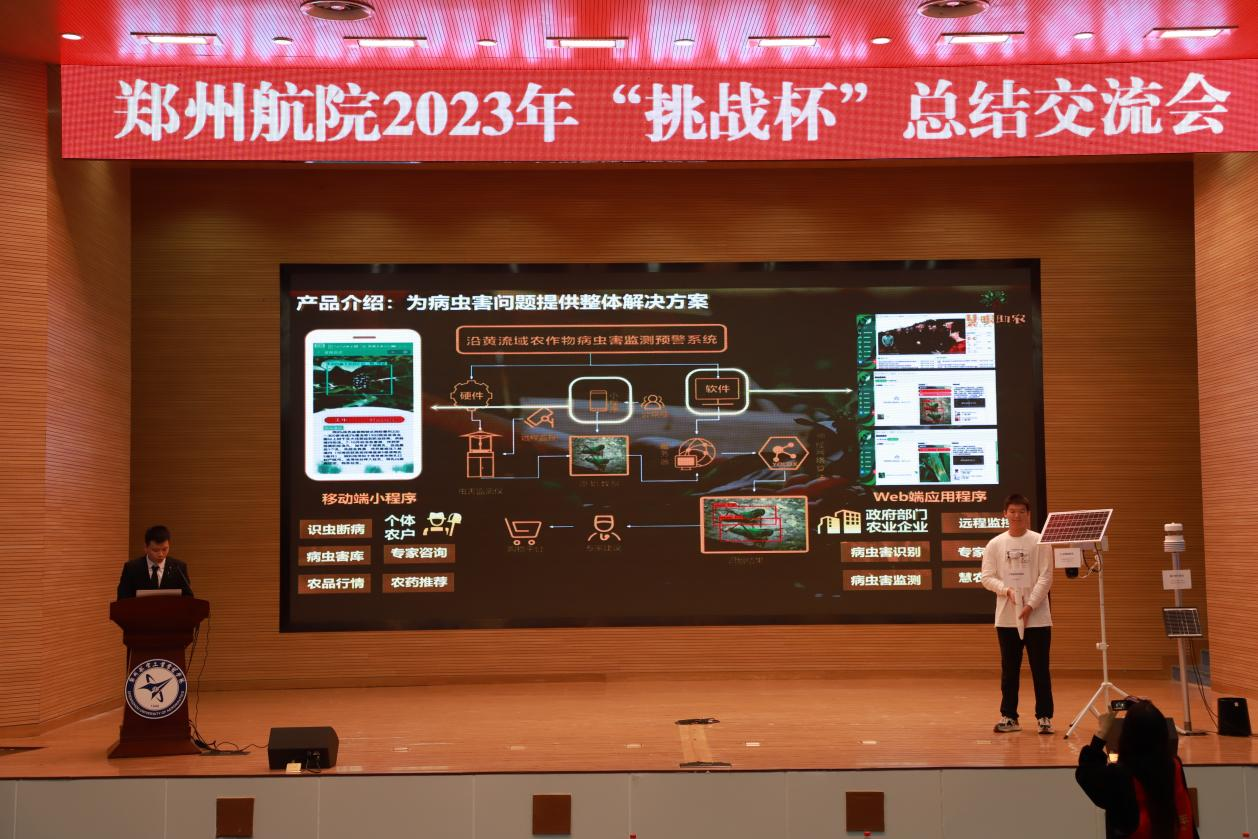 路演展示环节,2022年第十三届“挑战杯”中国大学生创业计划竞赛国赛铜奖作品——《慧眼助农:沿黄流域农作物病虫害监测预警系统》团队、2023年第十八届“挑战杯”全国大学生课外学术科技作品竞赛拟授国赛三等奖作品——《镇南飞将:岛屿值守快速响应可变翼无人机》团队依次上台交流展示。
