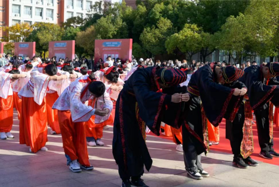 本次活动展现了中华民族传承千年的拜师盛礼。在庄重隆重的氛围中,72位身着传统汉服的莘莘学子,通过“尊师重道,立志于学”“礼拜孔子,致敬先贤”“鼎薪相传,行拜师礼”“大学之道,在明明德”等四个篇章精彩呈现中华优秀传统文化尊师重道的传统美德。