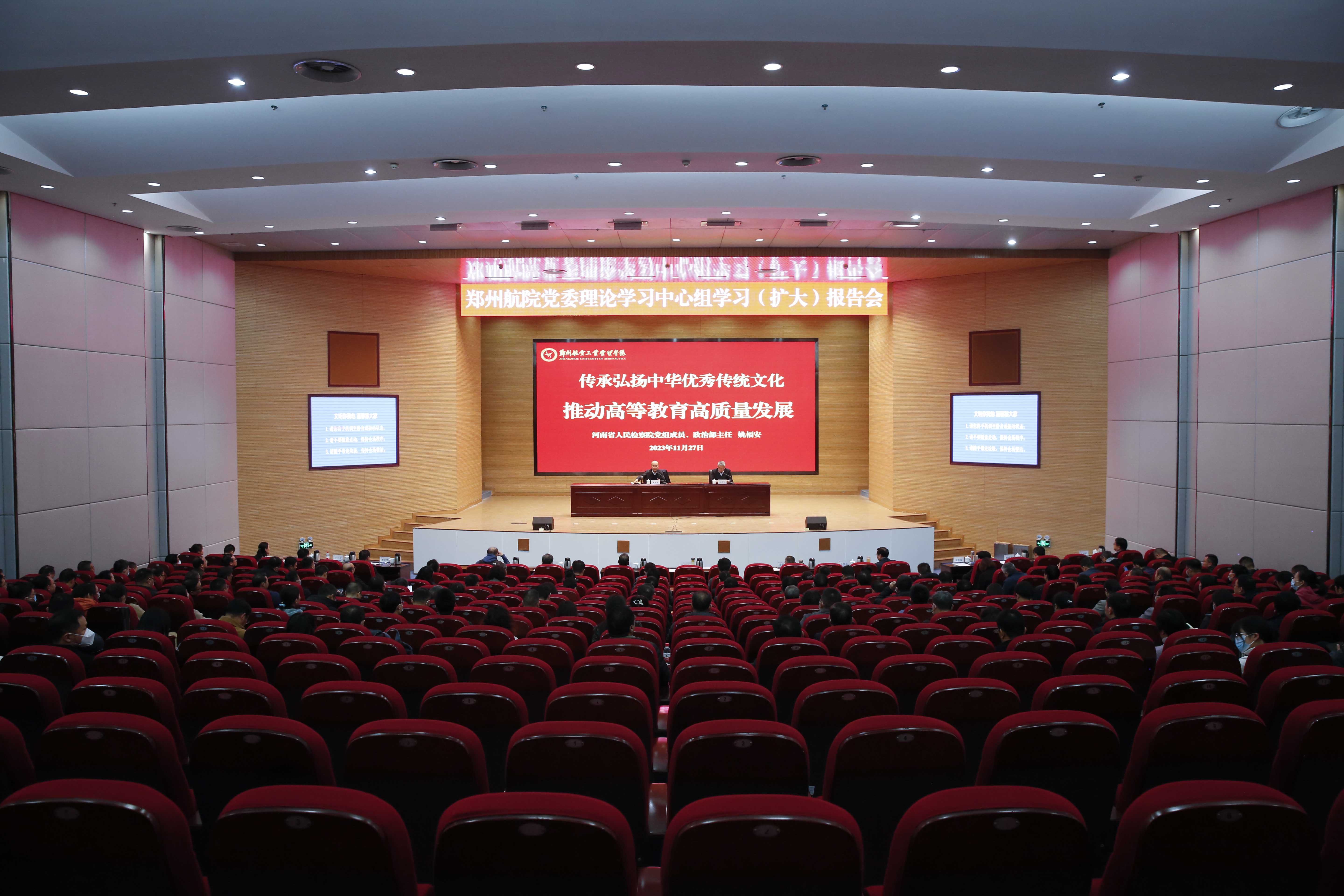 11月27日,校党委召开党委理论学习中心组学习(扩大)报告会,特邀河南省人民检察院党组成员、政治部主任姚福安作专题报告。全体在校校领导出席,党委书记、校长刘代军主持报告会并讲话。