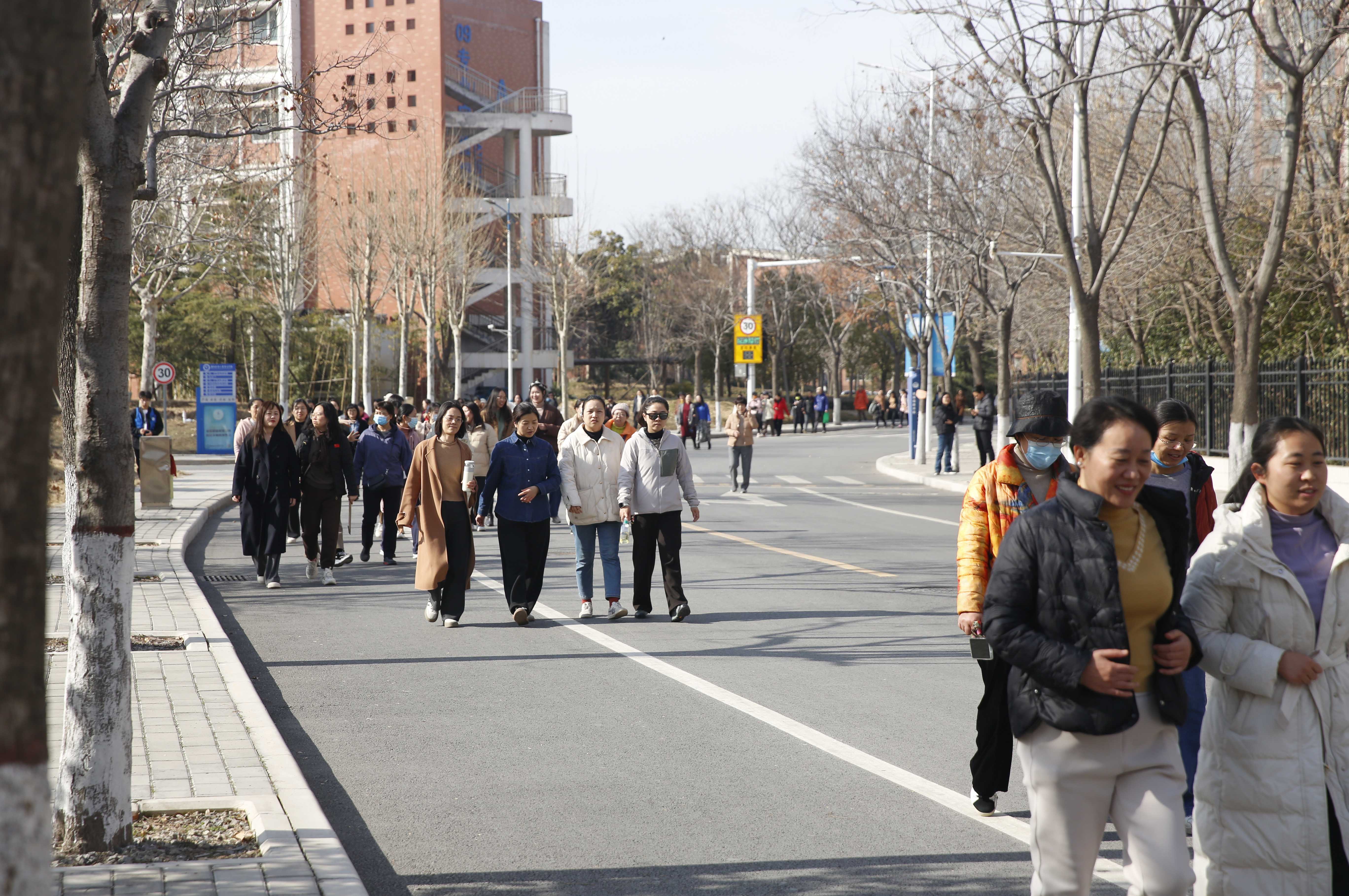 活动开始,女职工们从综合楼门前步行出发,向北沿校园外环经北门、西门、南门、东操场,最后到达综合楼北门结束徒步,她们一路健步前行、欢声笑语、神采飞扬,在校园里走出了一道靓丽的风景线。