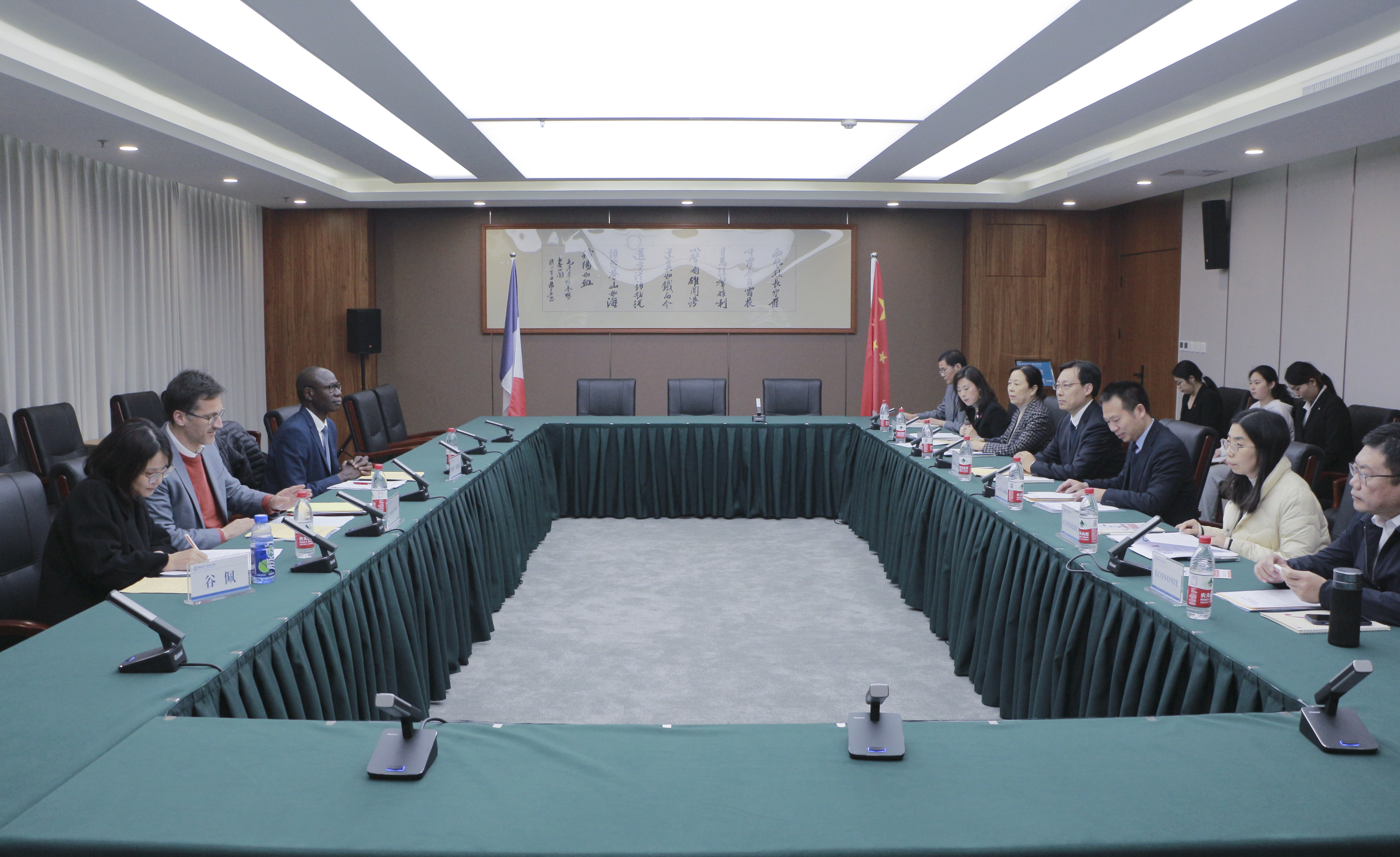 国际合作与交流处、商学院、经济学院、文法学院、外国语学院负责人参加会谈,与法方代表就合作框架协议和联合培养项目协议内容展开研讨。