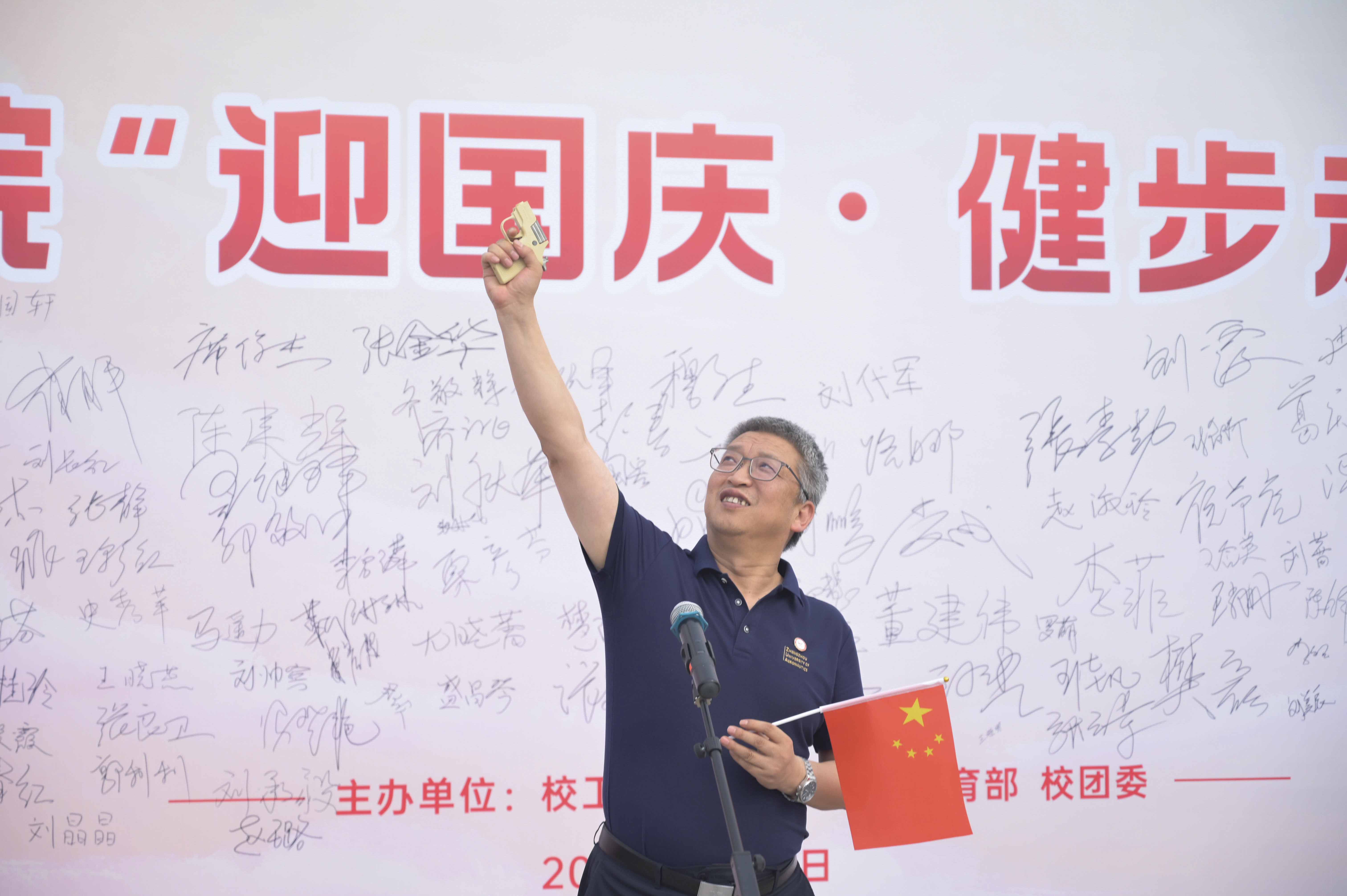 为庆祝中华人民共和国成立75周年,弘扬爱国主义精神,丰富教职工业余生活,9月26日,我校举办“迎国庆 健步走”活动。全体在校校领导出席活动启动仪式,与全校教职工一同参加活动。党委书记、校长刘代军为活动发令。启动仪式由副校长李广锋主持。