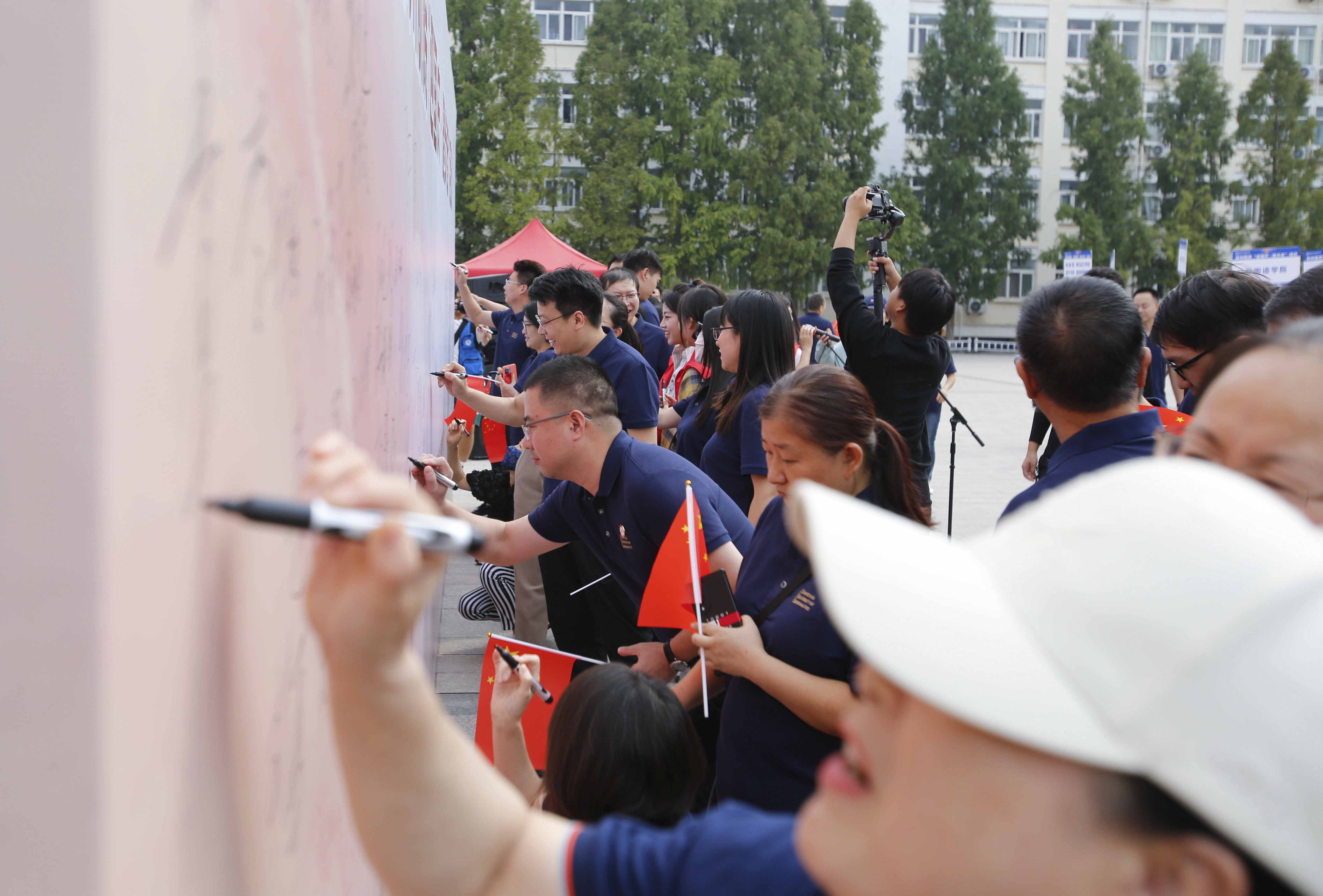 活动开始前,全体教职工身着统一服装齐聚在学校中心广场,陆续在喷绘墙上签名留言,以昂扬饱满的精神状态迎接活动的到来,广场上洋溢着欢乐的氛围。