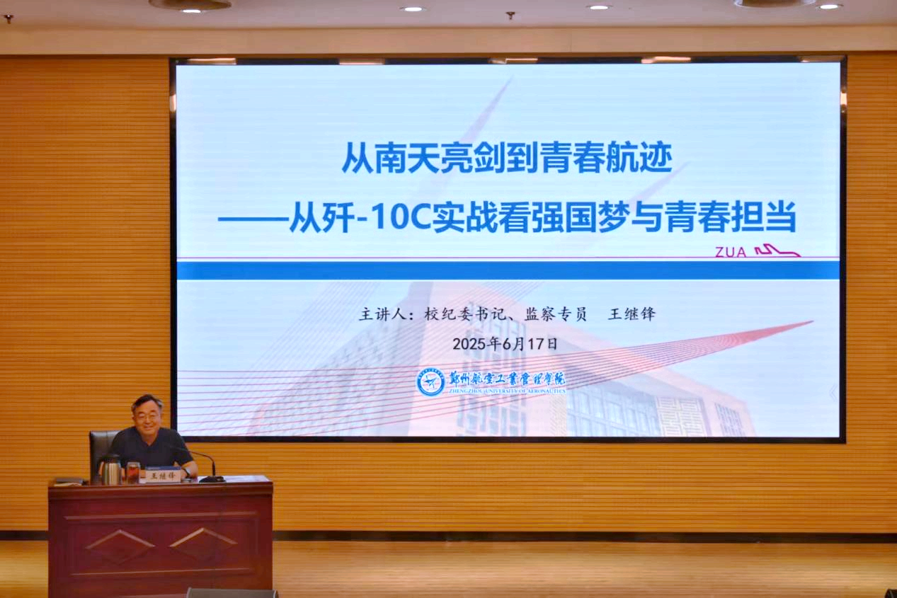 6月17日,校纪委书记、监察专员王继锋以“从南天亮剑到青春航迹——从歼-10C实战看强国梦与青春担当”为题,为经济学院、文法学院师生讲授专题思政课。