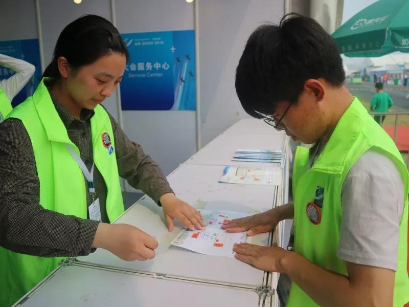 40余名后勤物料和行政客服的志愿者们在一号门二号门入口、仓库、综合体验区、音乐节和飞机坪这些站点一起工作,负责观光车的调度工作,同时还有整个航展各个的矿泉水发放以及在站点为游客们分发观展指南。当有人需要用车、领水的时候,志愿者们负责安排,同时要做好每一次的记录。