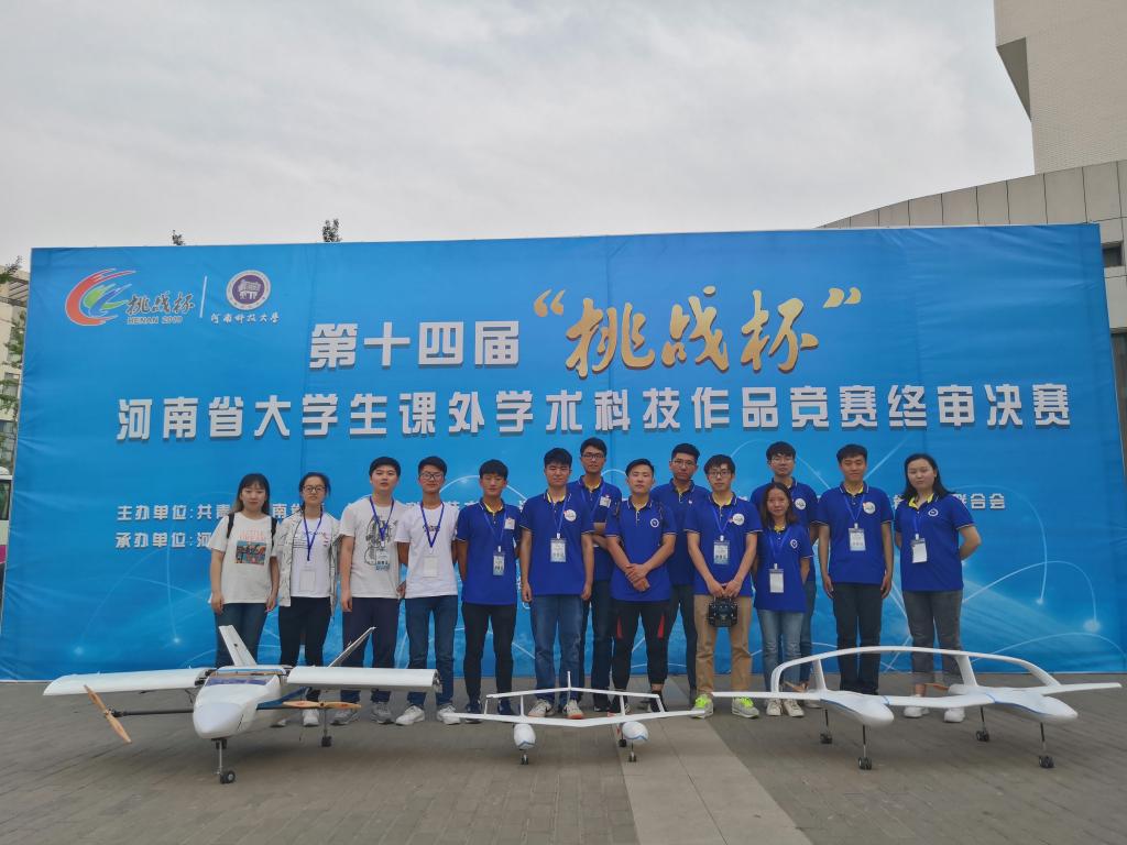 5月23日至27日,在第十四届“挑战杯”河南省大学生课外学术科技作品竞赛终审决赛中,我校创新实验团队作品《新型可变布局农用物流无人机》在省内65所高校上报入围的410件作品中脱颖而出,荣获特等奖。其团队成员有冯路启、姬同蒙、李卓远、何怡君、王艺龙、隆斯达、谭思奇、肖晓盼八人,冯路启是该项目负责人,指导老师为王晓璐。
