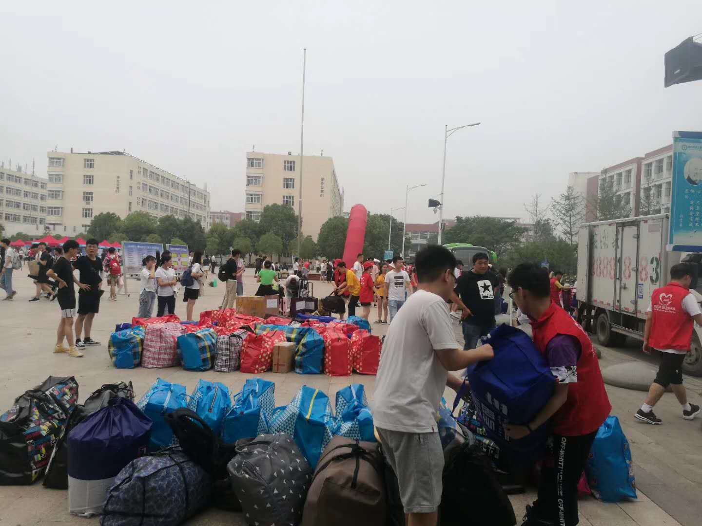 6月22—24日,2018级蓝天书院学生乘坐校车陆续抵达东校区,商学院、经济学院的志愿者在中心广场开展迎接工作。