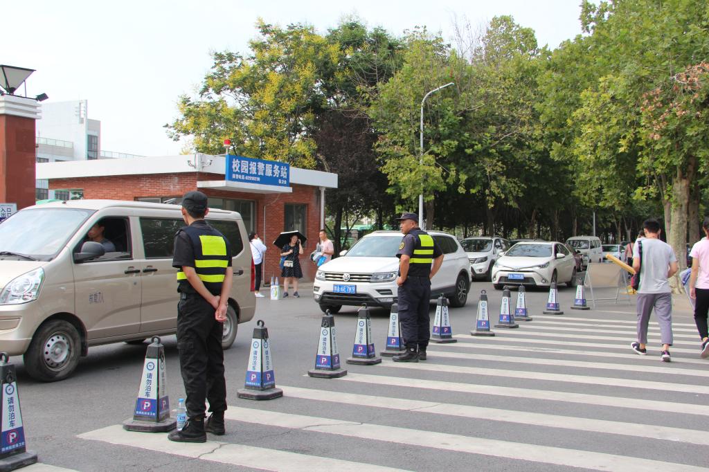 为保证校园内安全有序,保卫处在开学前就已经对校园交通路线做出合理规划,制作机动车通行路线图,布置引导牌及路障设施。除了安排固定停车场外,为方便新生搬运行李保卫处特别在各新生宿舍楼下增加临时停车场。保卫处工作人员分为两组进行全方位管控,校园里随处可见执勤的安保人员。