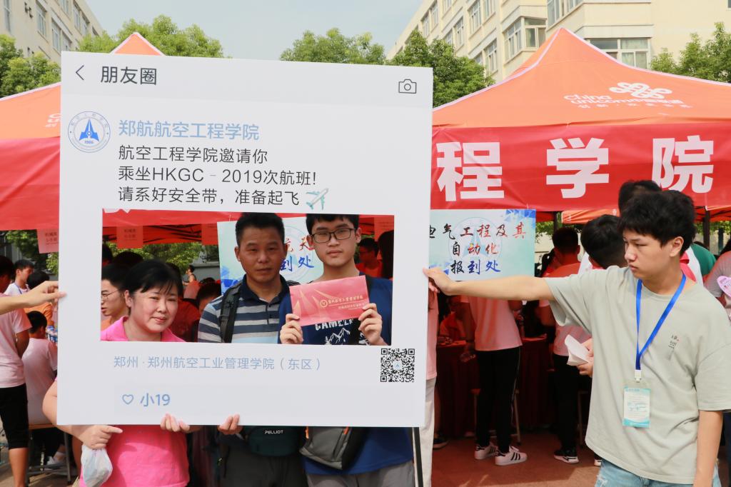 民航学院迎新大本营旁边摆放一块展板,供新生及家长写下对大学的期待和寄语,新生们在展板前开心的合影留念。航空工程学院特别制作了一个“朋友圈”相框,新生和家长们纷纷拿着录取通知书合影留念,“要和孩子合影,发一个特别的‘朋友圈’,让朋友来点赞。”一位新生家长说。