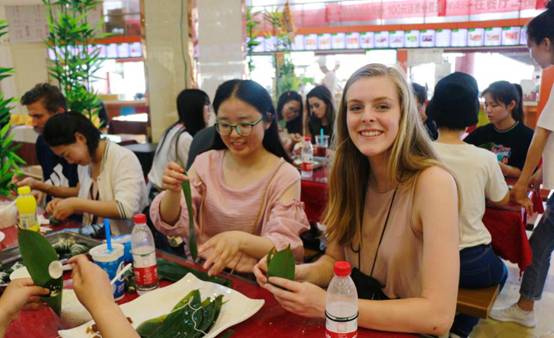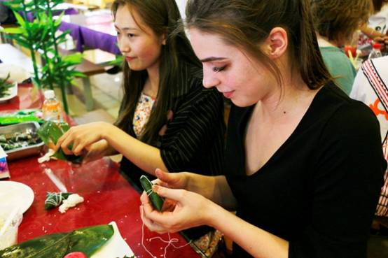 传统文化体验活动来到西苑餐厅。折粽叶、装糯米、放馅料、裹紧扎绳……学生们在志愿者的陪同下来到西苑三楼学习包粽子,体验浓浓端午情。