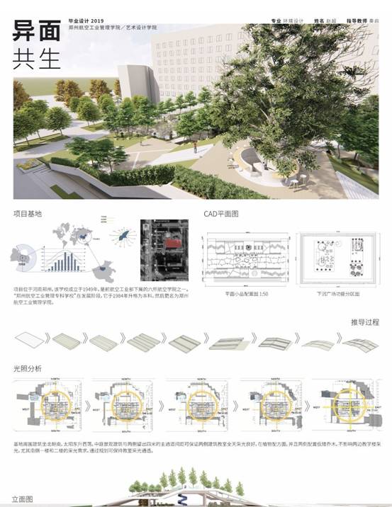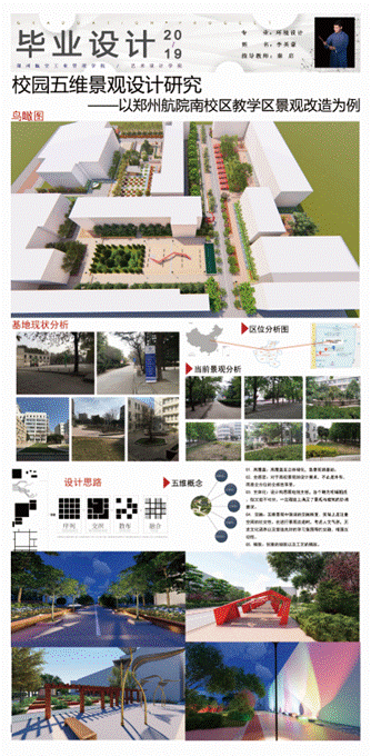 作品简介:五维景观设计研究—郑州航院南校区教学区景观改造为例,运用五维概念对老校区景观重新规划进行整改。