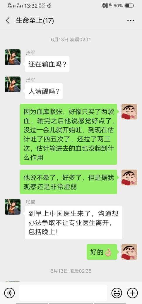 侯小阳刚到医院时呕血不止,而且还有血尿血便症状。“我用纸巾和抹布不停地擦拭床单被罩上的血液和污渍,看着朝夕相处的工友此刻承受的痛苦,我心里极其难受。”等侯小阳用上了氧气机,开始输血,病情基本稳定,秦建栋就每隔一两个小时在微信群里发送病人的病情,让更多牵挂侯小阳的同事放心。