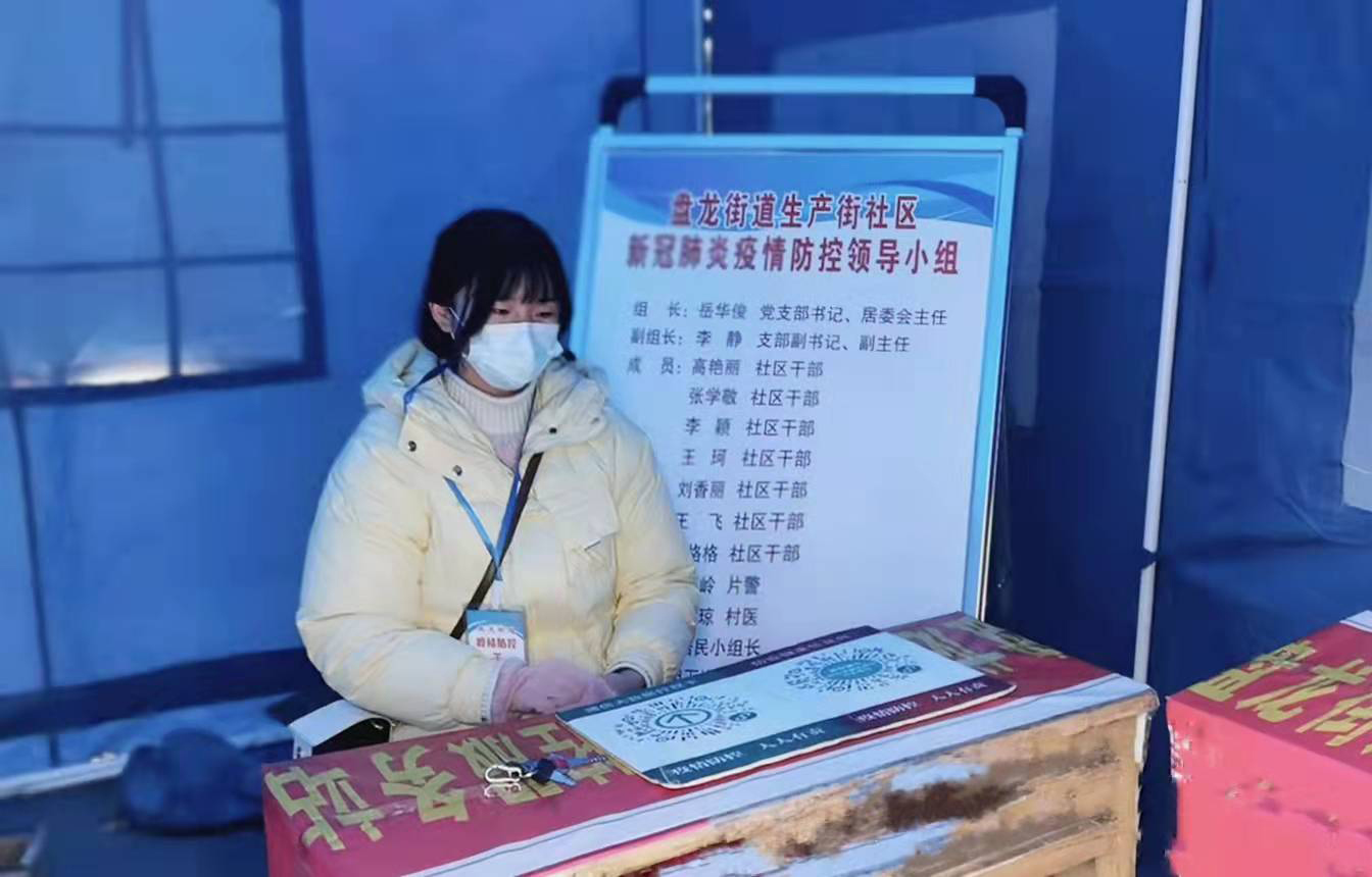 陈斯佳值岗的疫情检查站是盘龙街道办事处路口,主要负责对出入人员进行体温测量,查验健康码,登记过往人员信息。当时恰逢严寒,地上甚至出现厚厚的积雪。尽管防疫帐篷透风,最冷的时候,寒风灌进身体,脚踝冻的发紫,但陈斯佳丝毫没有退缩,她笑着说:“每一天都很充实,能做一些力所能及的事情,我很满足。”