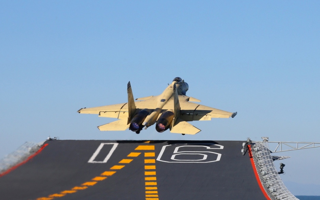 16、15、14,这几个看似平凡无奇的数字,却隐藏着打开歼15档案的“密码”——伴随着震耳欲聋的轰鸣声,舷号16的辽宁舰上起飞偏流板升起,代号“飞鲨”的歼15飞机宛若离弦之箭,迅速通过14°的舰艏甲板滑跃起飞,直指苍穹,成就了那一个经典的画面。