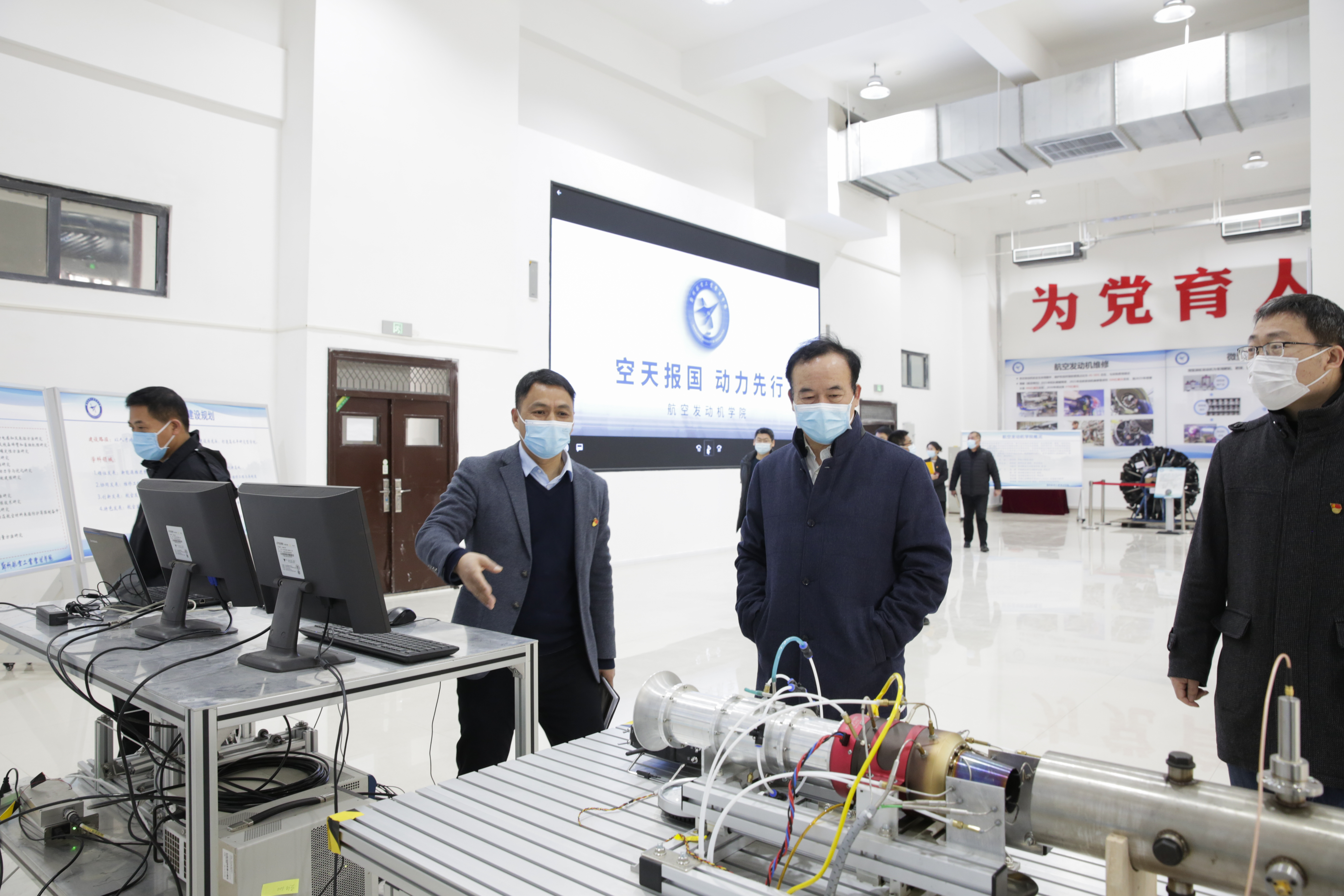 在航空动力实验中心,付强听取学院负责人汇报、询问学院发展规划、察看高层次人才引育进度,了解航空发动机早期故障预警技术、涡轮叶片精密制造过程等,他指出,没有航空航天类工科的强劲发展,郑航就走不快、走不远。航空发动机学院、航空宇航学院要抢抓千载难逢的历史机遇,瞄准河南省“十大战略”和航空航天科技前沿,站位学校航空航天工科专业建设新格局,为实现郑航的“跨越式发展”提供强有力的学科支撑。