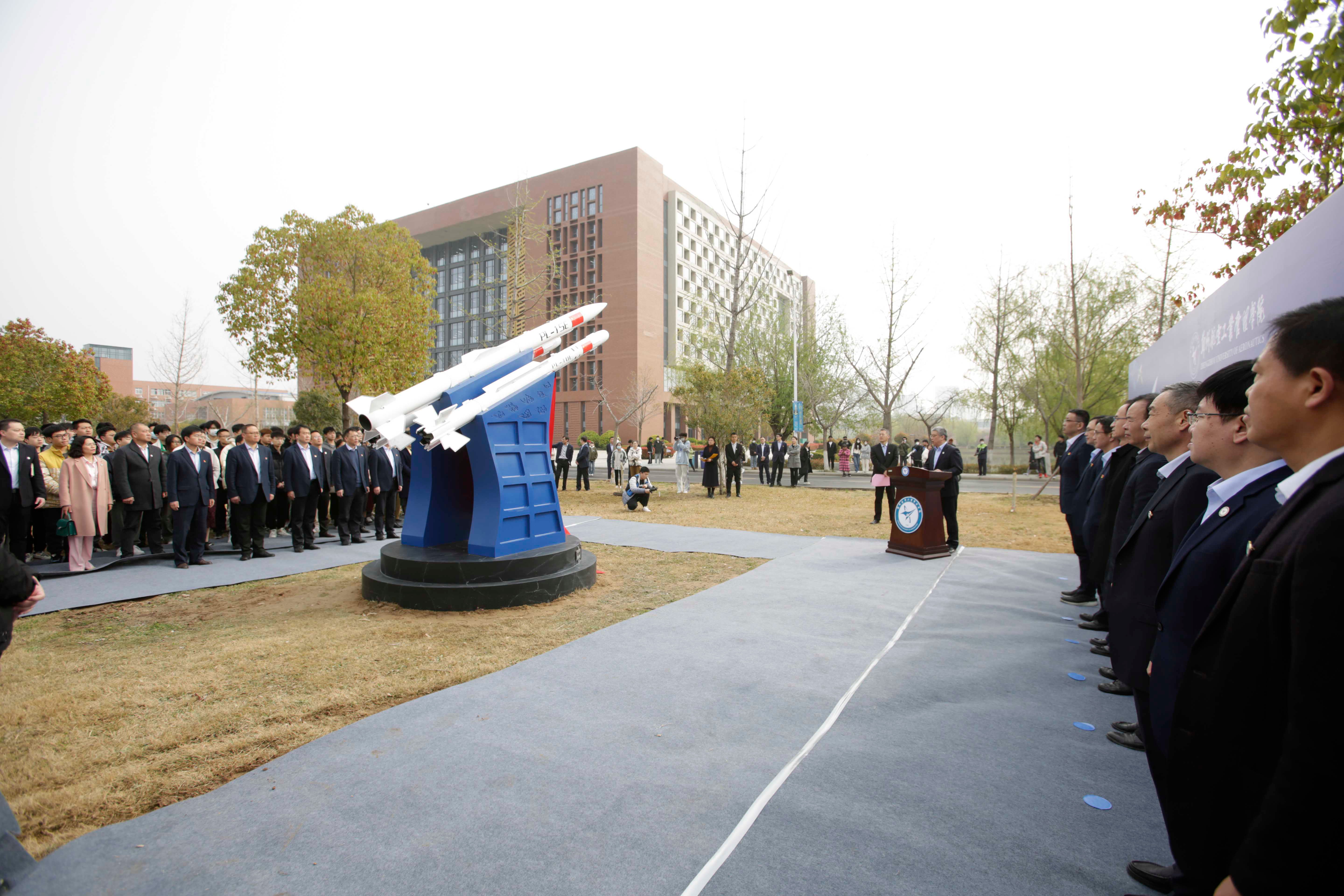 落成仪式上,中国空空导弹研究院党委书记张海强、总设计师崔颢和我校党委书记付强、校长刘代军,共同为主题雕塑“航威威”落成启幕。