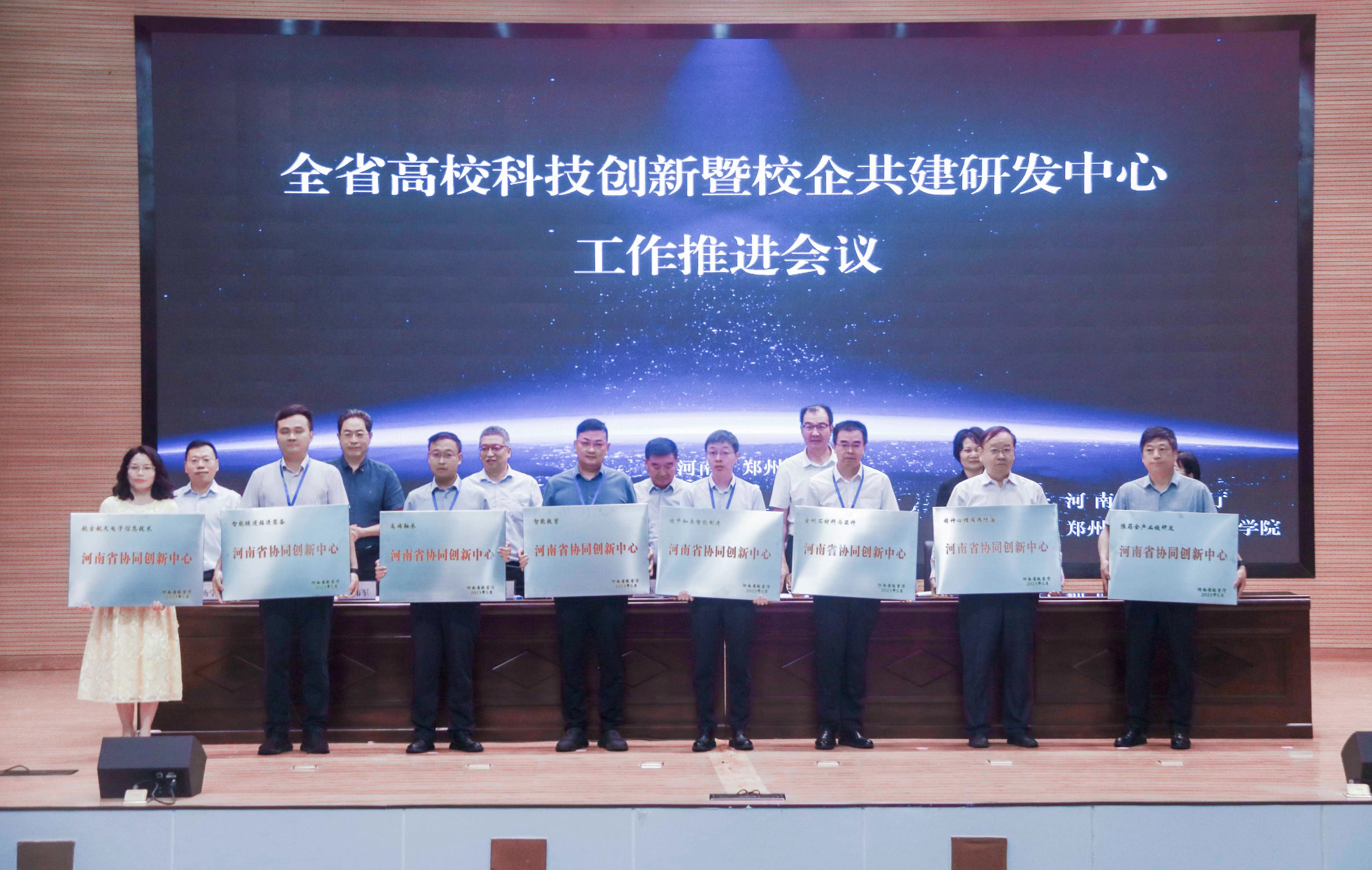 会议向省部共建协同创新中心、2023年度河南省协同创新中心和首批河南省高校科技成果转移转化基地授牌。
