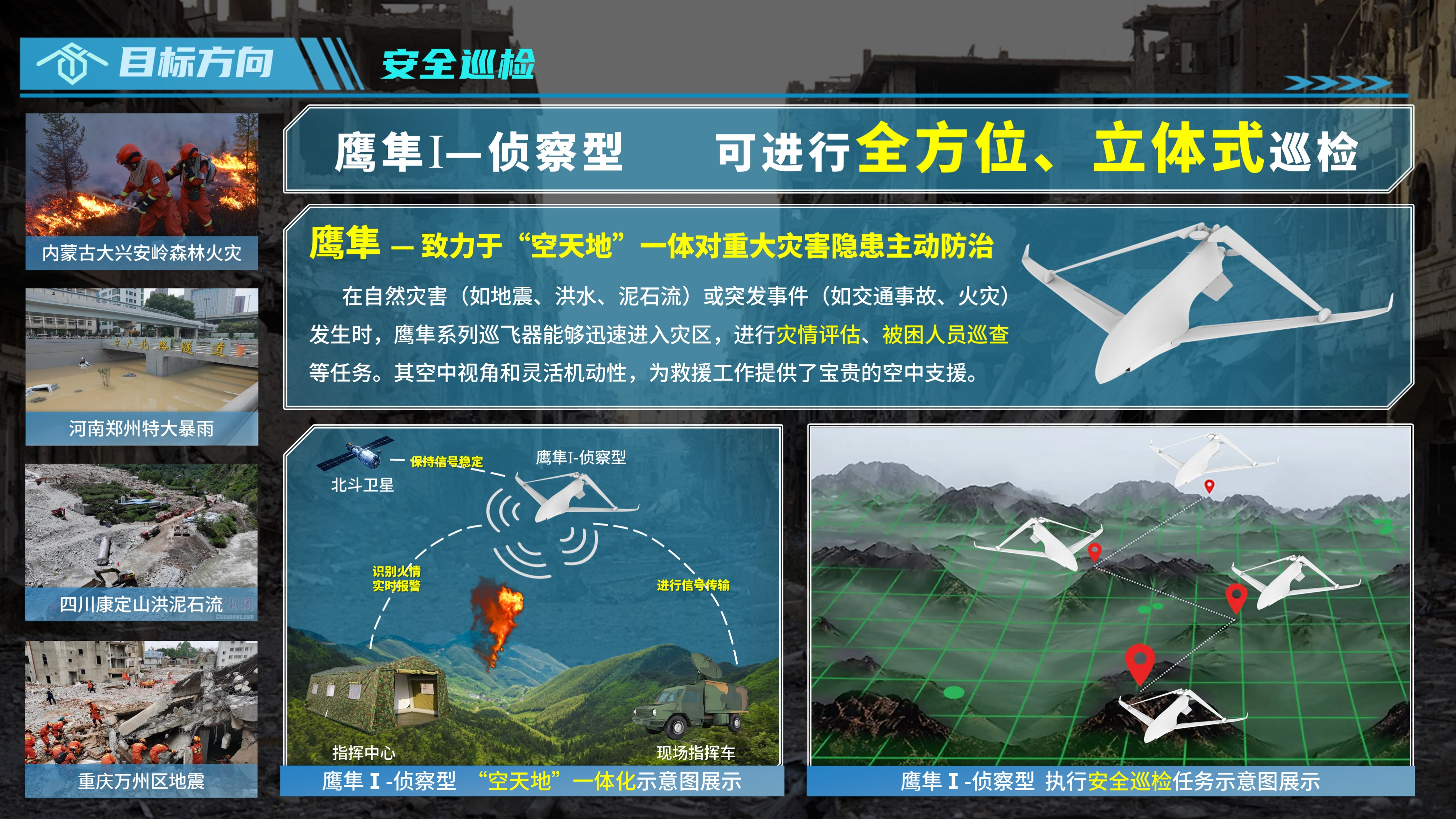 项目简介:针对大型自然灾害快速应急救援中出现的救援时效性差、复杂环境可达性差等痛点问题,项目团队设计并试飞验证了三个创新方案,采用三大创新技术:一是采用多旋翼+固定翼融合设计,实现长续航、可垂起、能耗低、救援快目标;二是采用多旋翼+履带越障车融合设计,解决小型、中型、大型障碍的越障能力问题;三是飞行+履带一体化特种控制系统,可实现地面越障和复合翼飞行控制系统的功能融合,适应多模型任务。项目制作验证机4架,已实现气动性能仿真、飞行测试、地面越障等多种任务场景的飞行试验,授权专利10余项,获航天科技集团、中国航空学会主办的“彩虹杯”无人飞行器大赛全国第一名、国赛特等奖。