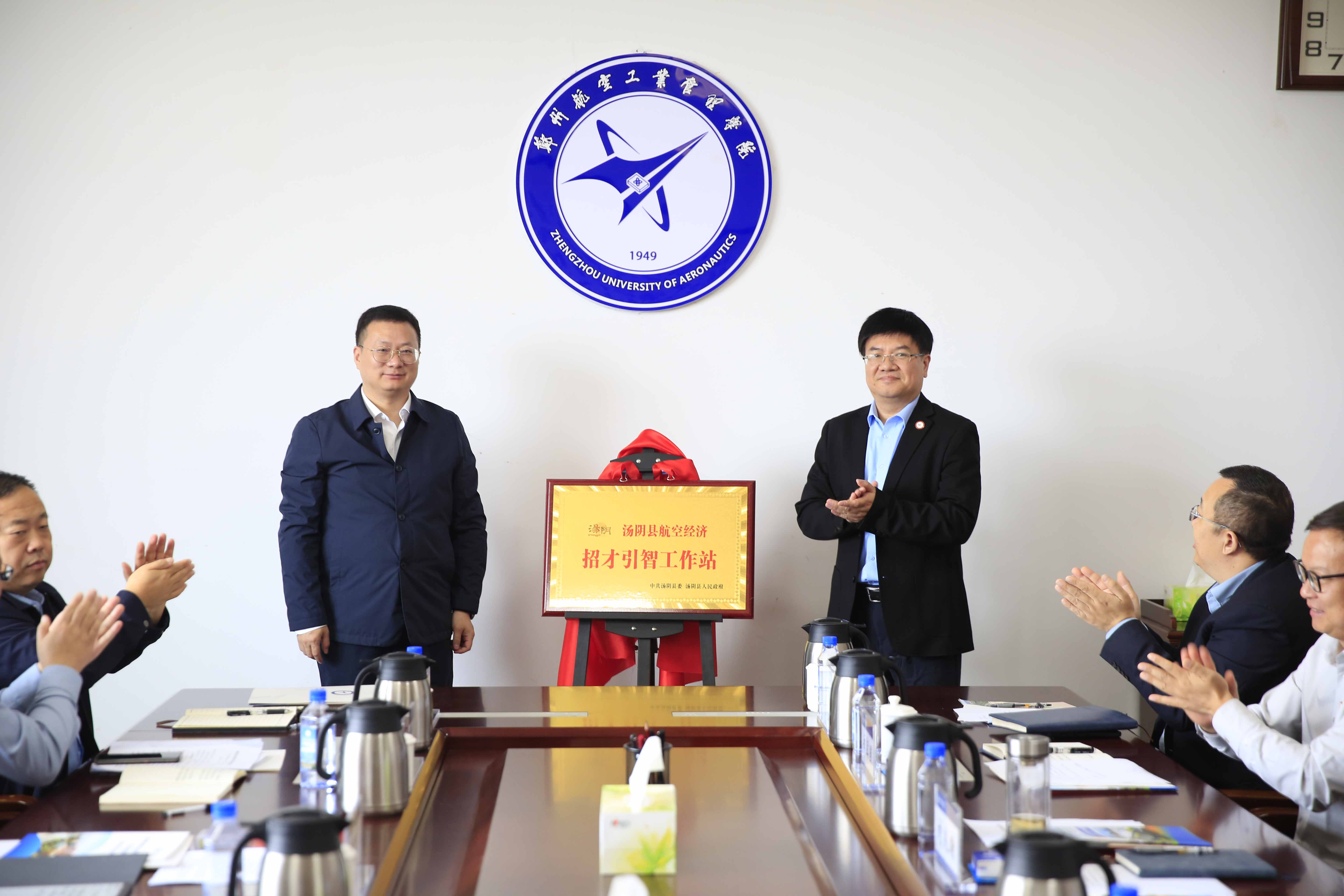 会上,刘兆瑜、秦健鹏共同为“郑州航院汤阴县航空经济招才引智工作站”揭牌。