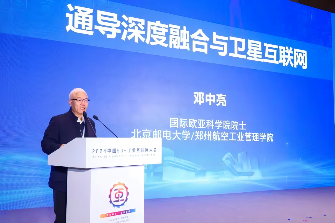 邓中亮与刘经南、张平文、梅涛等院士专家以及中国商飞董事长贺东风、中国广电董事长宋起柱、中国信科总经理何书平等行业企业家代表,重点围绕工业互联网融合应用、人工智能、智能网联汽车、低空经济等领域进行交流。邓中亮在会上作了《通导深度融合与卫星互联网》专题报告,从万物互联与时空感知、6G关键技术、卫星互联网的通信与导航关键技术等方面,分析了行业发展新态势。