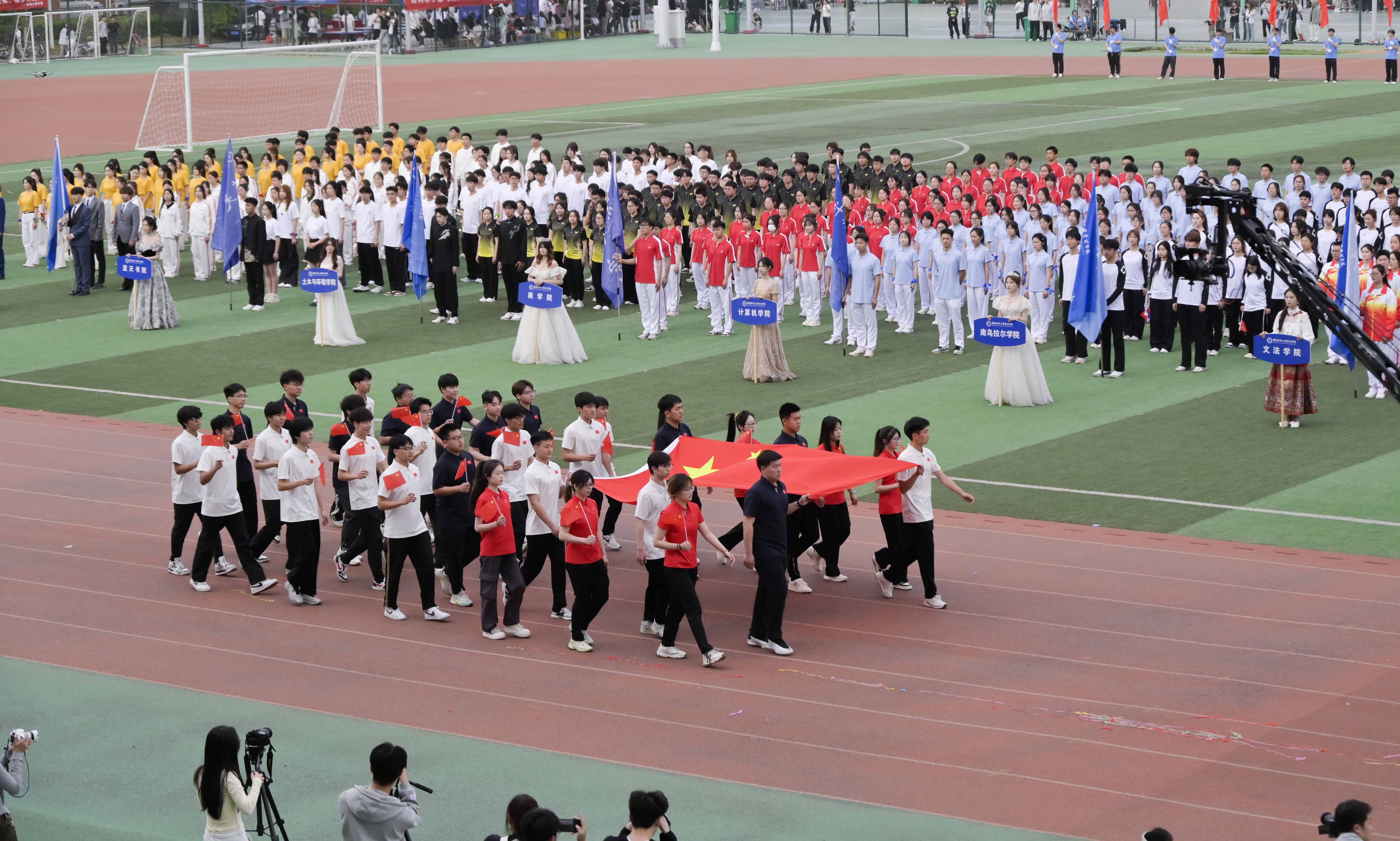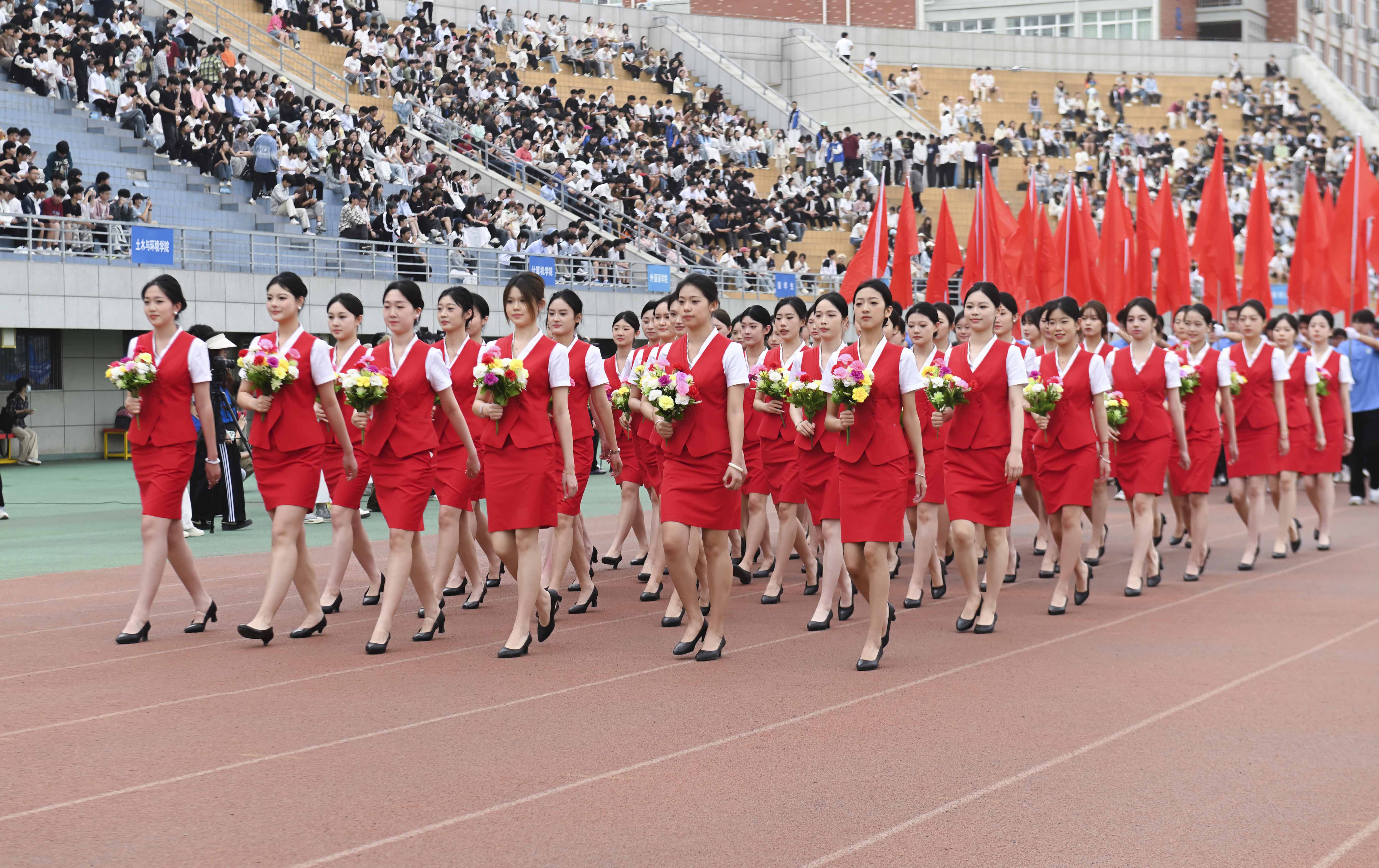 开幕式在激昂的旋律中拉开帷幕。伴随着《运动员进行曲》,各学院方队依次入场,他们身着统一服装,步伐铿锵、口号嘹亮,释放出青春的活力与昂扬的斗志。