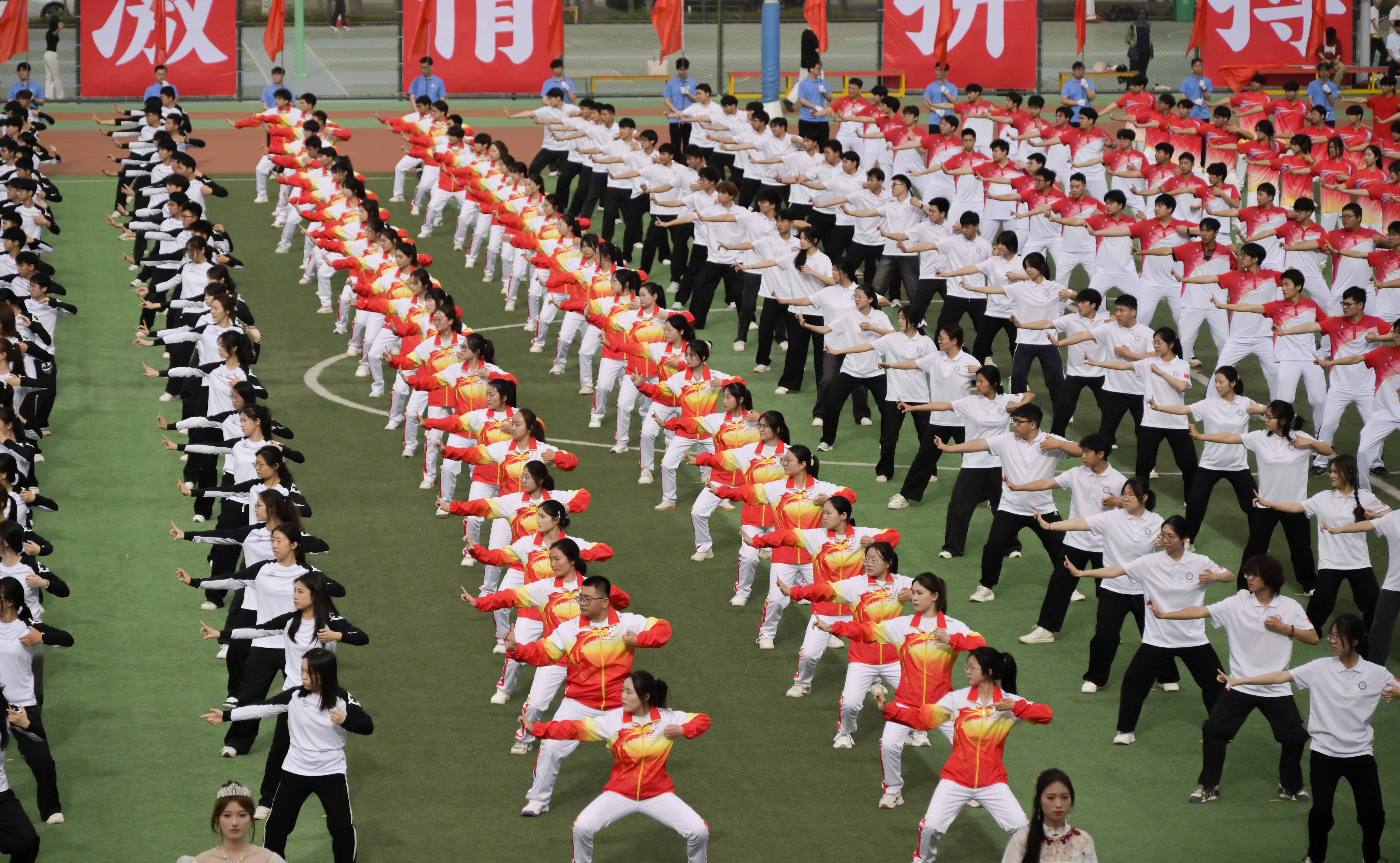 千余名学生共同表演传统健身项目“八段锦”,动作行云流水,展现出中华体育文化的魅力。随后的啦啦操表演激情澎湃,将现场气氛推向高潮。